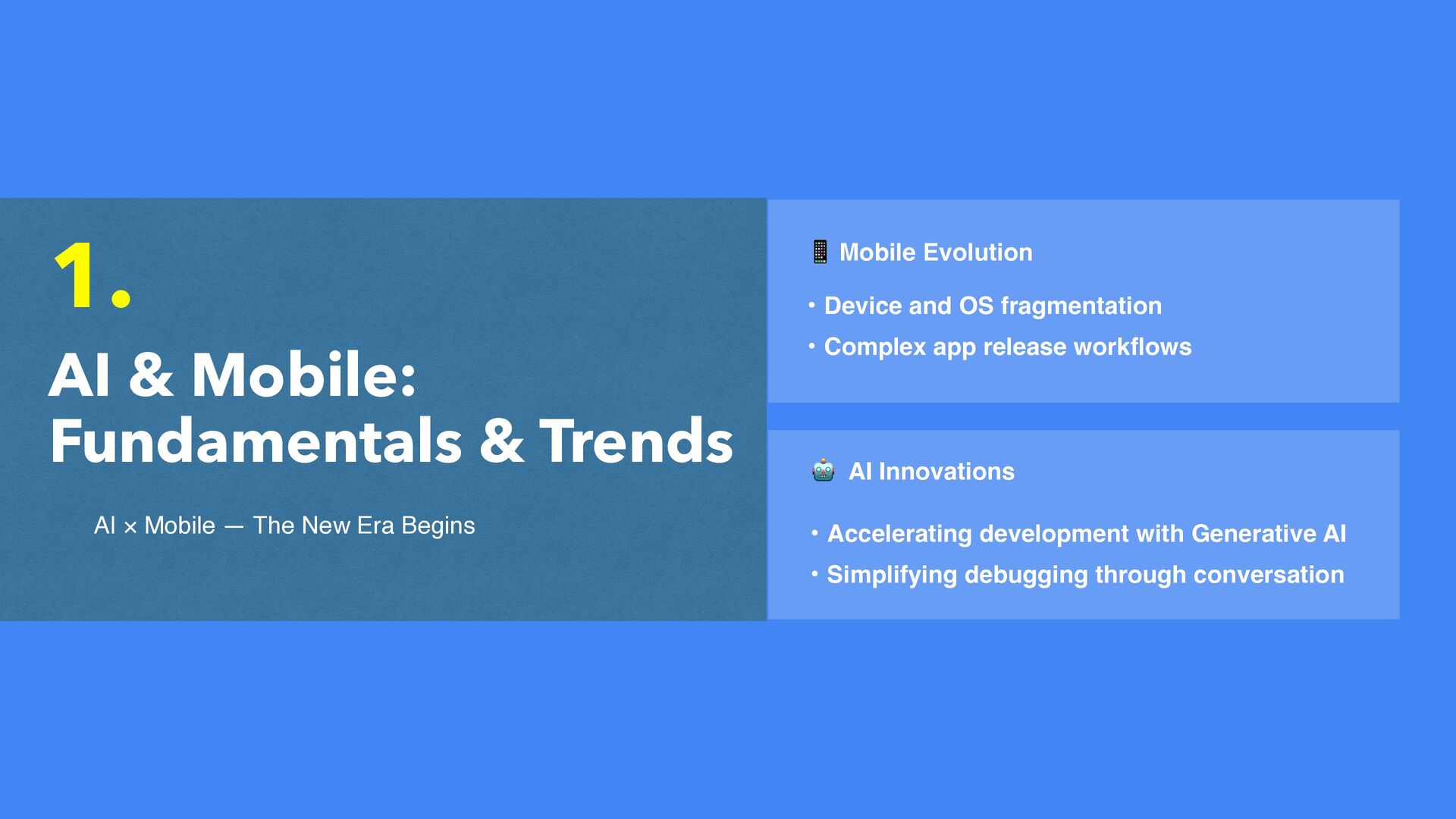 Generative AI ɾSimplifying debugging through conversation AI × Mobile — The New Era Begins ɾDevice and OS fragmentation ɾComplex app release workflows 🤖 AI Innovations 📱 Mobile Evolution