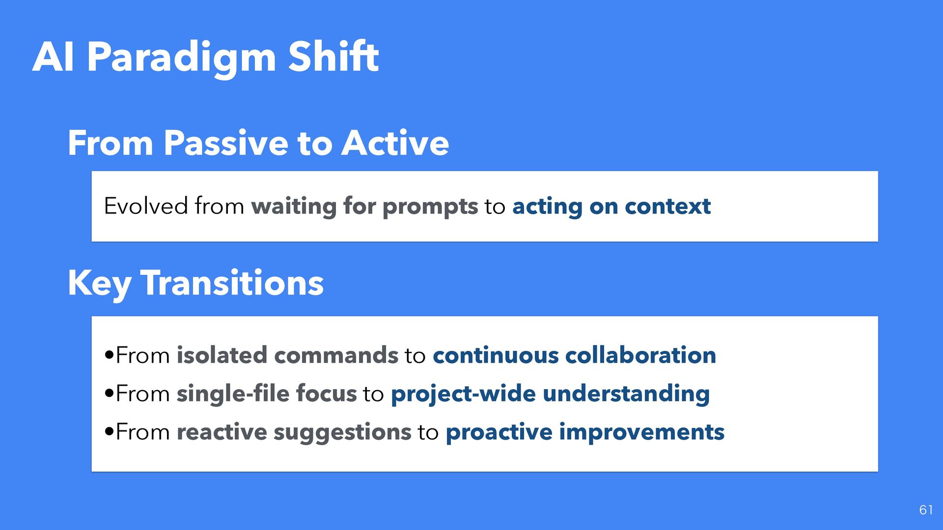 Evolved from waiting for prompts to acting on context •From isolated commands to continuous collaboration •From single- fi le focus to project-wide understanding •From reactive suggestions to proactive improvements