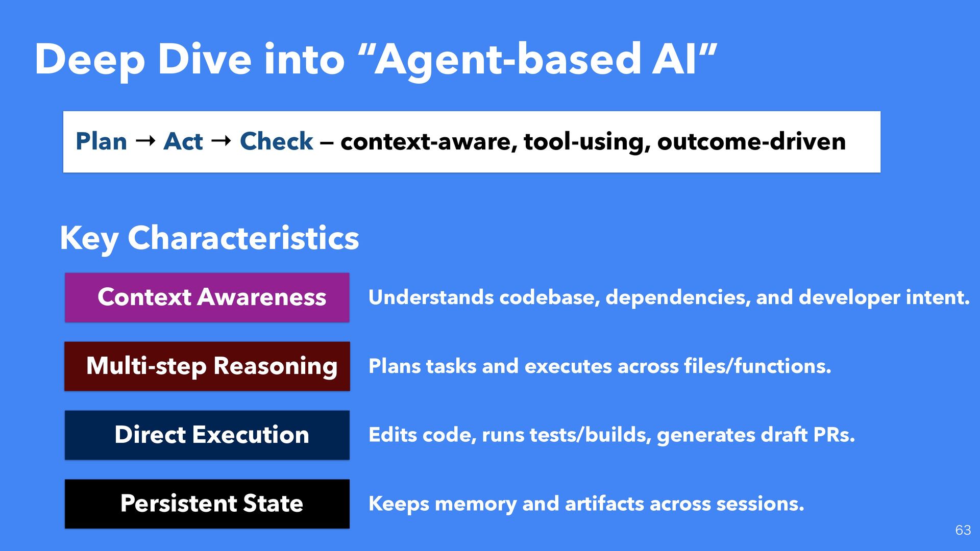 Check — context-aware, tool-using, outcome-driven Key Characteristics Context Awareness Multi ‑ step Reasoning Direct Execution Persistent State Understands codebase, dependencies, and developer intent. Plans tasks and executes across fi les/functions. Edits code, runs tests/builds, generates draft PRs. Keeps memory and artifacts across sessions.