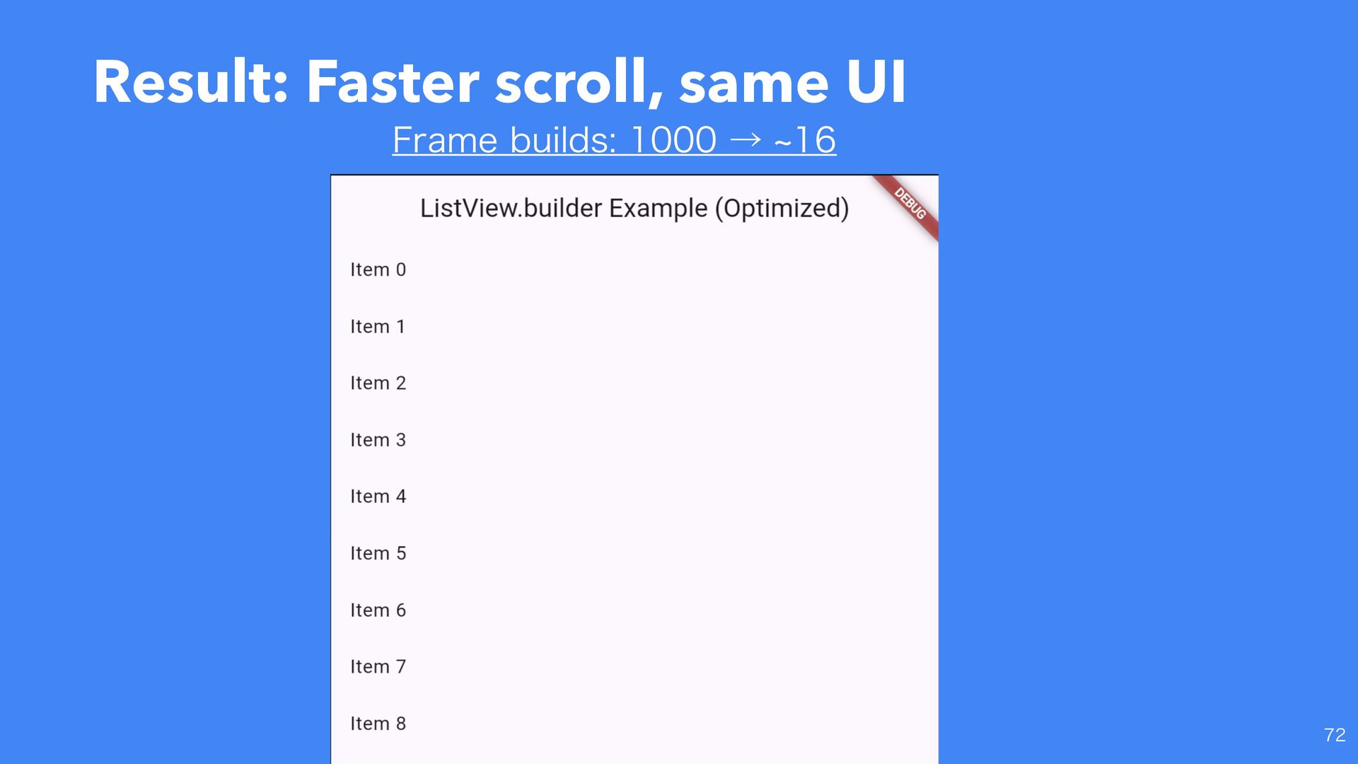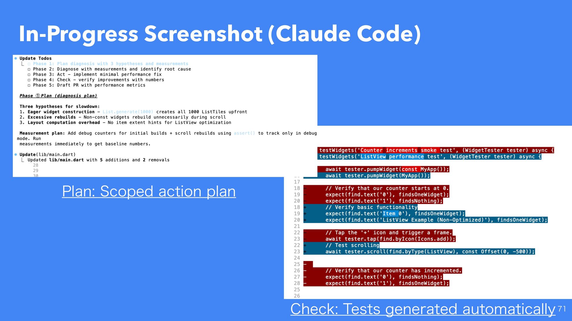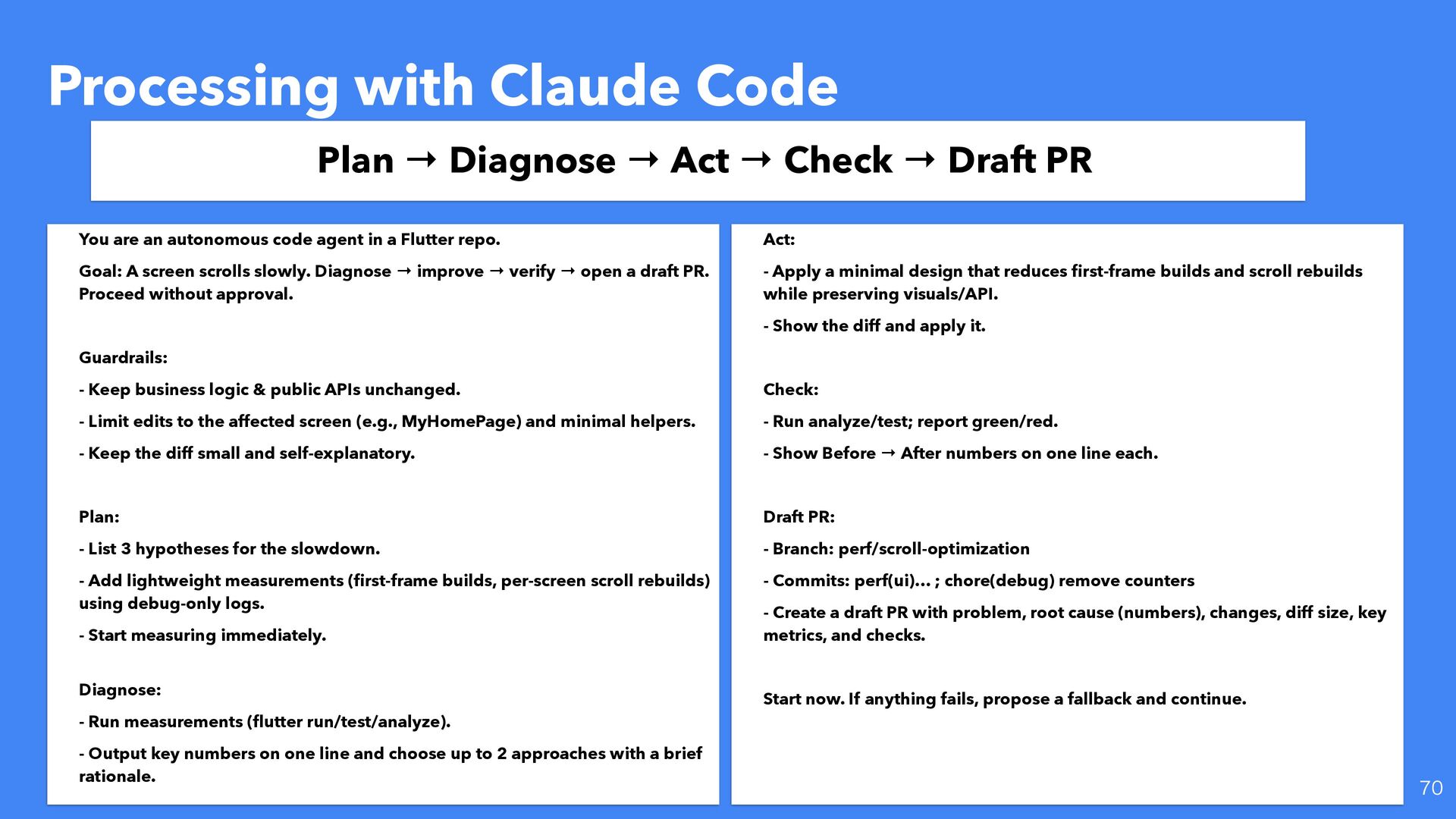 agent in a Flutter repo. Goal: A screen scrolls slowly. Diagnose → improve → verify → open a draft PR. Proceed without approval. Guardrails: - Keep business logic & public APIs unchanged. - Limit edits to the affected screen (e.g., MyHomePage) and minimal helpers. - Keep the diff small and self-explanatory. Plan: - List 3 hypotheses for the slowdown. - Add lightweight measurements ( fi rst-frame builds, per-screen scroll rebuilds) using debug-only logs. - Start measuring immediately. Diagnose: - Run measurements ( fl utter run/test/analyze). - Output key numbers on one line and choose up to 2 approaches with a brief rationale. Act: - Apply a minimal design that reduces fi rst-frame builds and scroll rebuilds while preserving visuals/API. - Show the diff and apply it. Check: - Run analyze/test; report green/red. - Show Before → After numbers on one line each. Draft PR: - Branch: perf/scroll-optimization - Commits: perf(ui)… ; chore(debug) remove counters - Create a draft PR with problem, root cause (numbers), changes, diff size, key metrics, and checks. Start now. If anything fails, propose a fallback and continue. Plan → Diagnose → Act → Check → Draft PR
