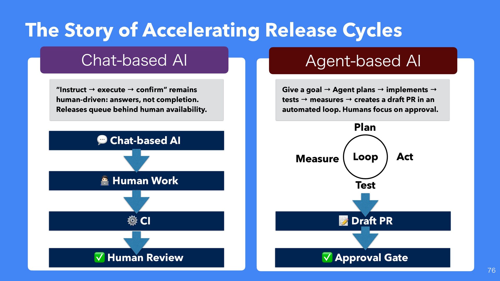 → execute → con fi rm” remains human-driven: answers, not completion. Releases queue behind human availability. Give a goal → Agent plans → implements → tests → measures → creates a draft PR in an automated loop. Humans focus on approval. 💬 Chat-based AI 🧑💻 Human Work ⚙ CI ✅ Human Review 📝 Draft PR ✅ Approval Gate Plan Act Test Measure Loop