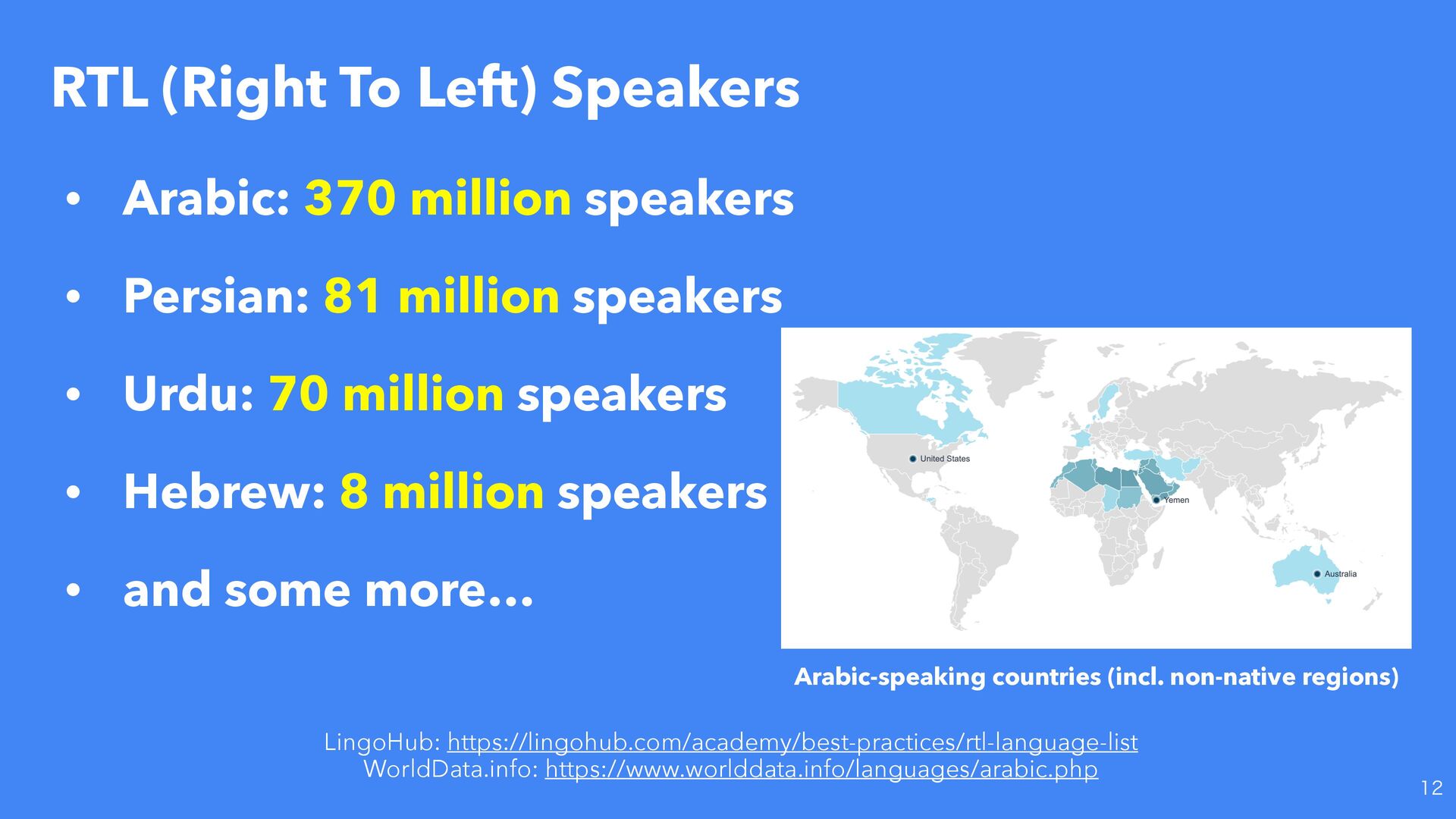 speakers • Persian: 81 million speakers • Urdu: 70 million speakers • Hebrew: 8 million speakers • and some more… LingoHub: https://lingohub.com/academy/best-practices/rtl-language-list WorldData.info: https://www.worlddata.info/languages/arabic.php Arabic-speaking countries (incl. non-native regions)