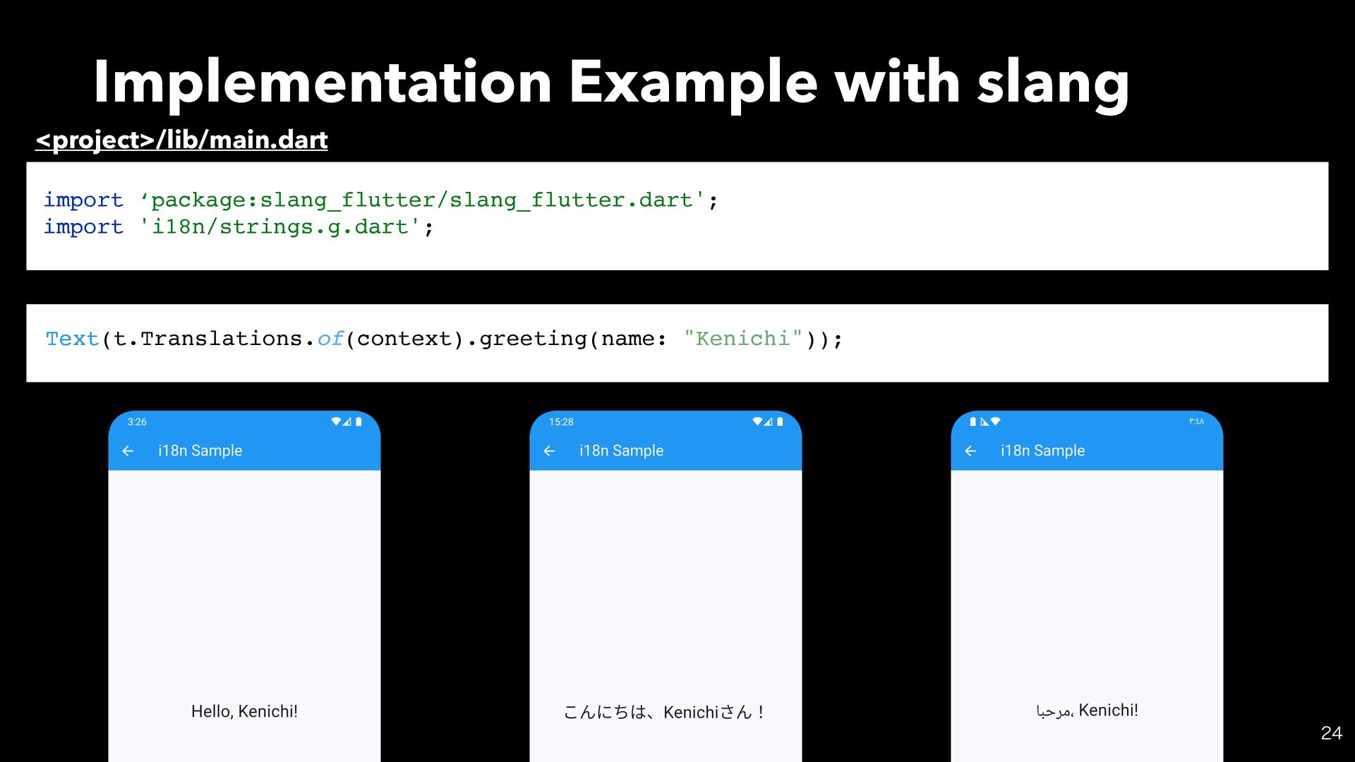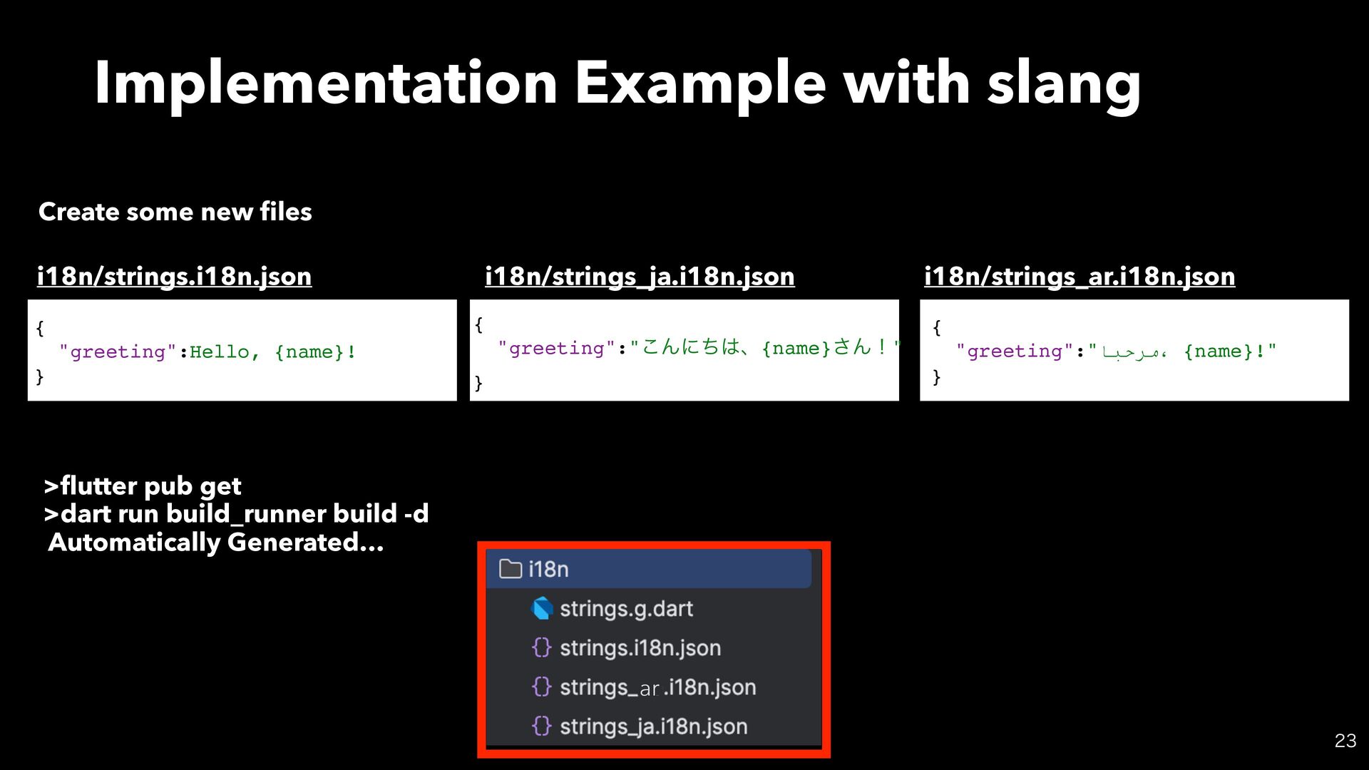 new fi les i18n/strings.i18n.json { "greeting":"͜Μʹͪɺ{name}͞Μʂ" } { "greeting":"ﺎﺒﺣﺮﻣ، {name}!" } i18n/strings_ja.i18n.json i18n/strings_ar.i18n.json > fl utter pub get >dart run build_runner build -d Automatically Generated… ar