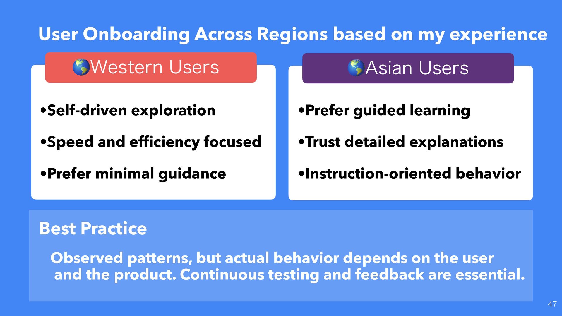 Practice 🌎8FTUFSO6TFST •Self-driven exploration •Speed and ef fi ciency focused •Prefer minimal guidance 🌎"TJBO6TFST •Prefer guided learning •Trust detailed explanations •Instruction-oriented behavior Observed patterns, but actual behavior depends on the user and the product. Continuous testing and feedback are essential.