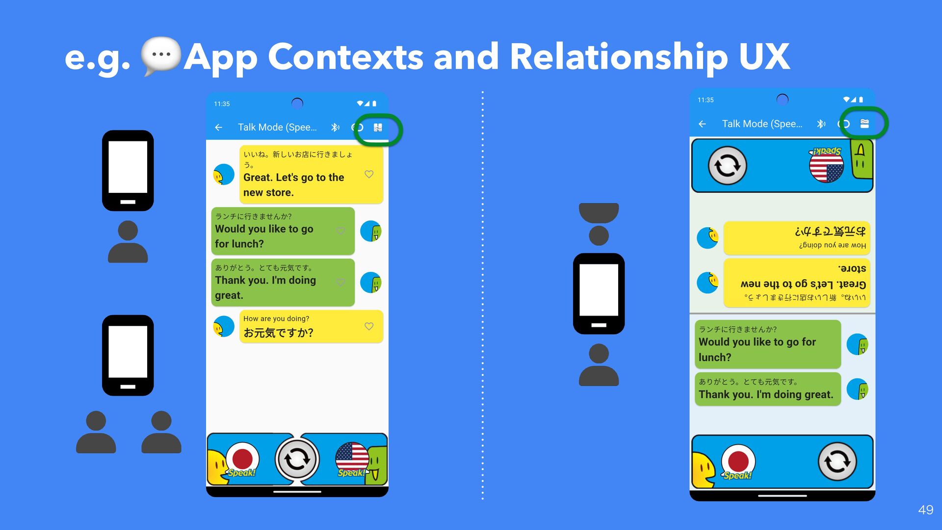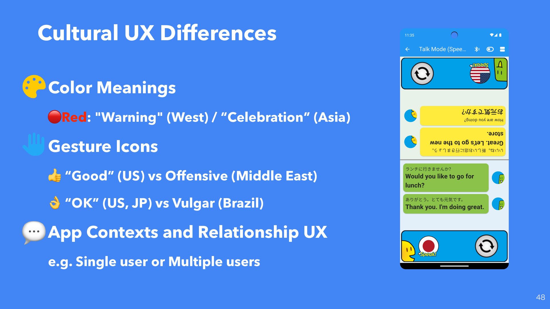 “Celebration” (Asia) Gesture Icons 👍 “Good” (US) vs Offensive (Middle East) 👌 “OK” (US, JP) vs Vulgar (Brazil) App Contexts and Relationship UX e.g. Single user or Multiple users 💬