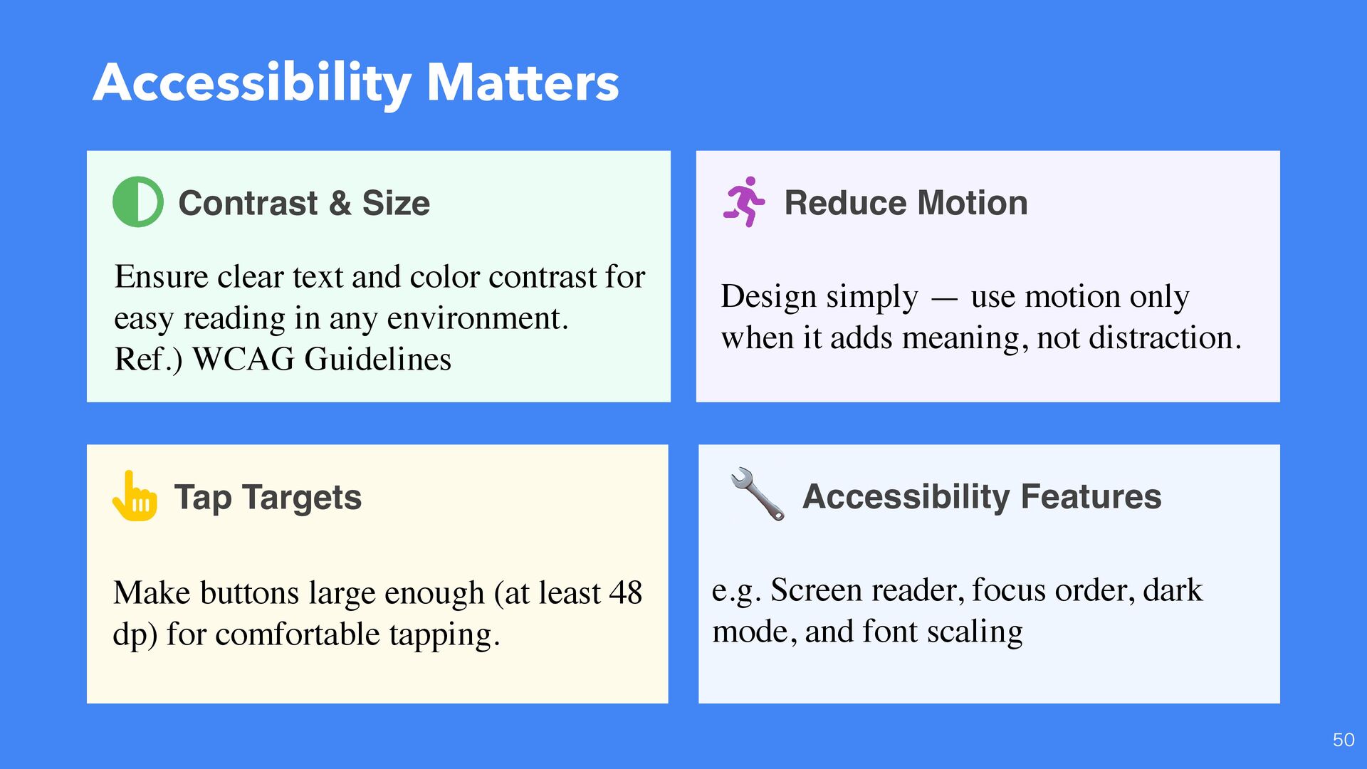 color contrast for easy reading in any environment. Ref.) WCAG Guidelines Reduce Motion Design simply — use motion only when it adds meaning, not distraction. Accessibility Features Tap Targets Make buttons large enough (at least 48 dp) for comfortable tapping. 🔧 e.g. Screen reader, focus order, dark mode, and font scaling
