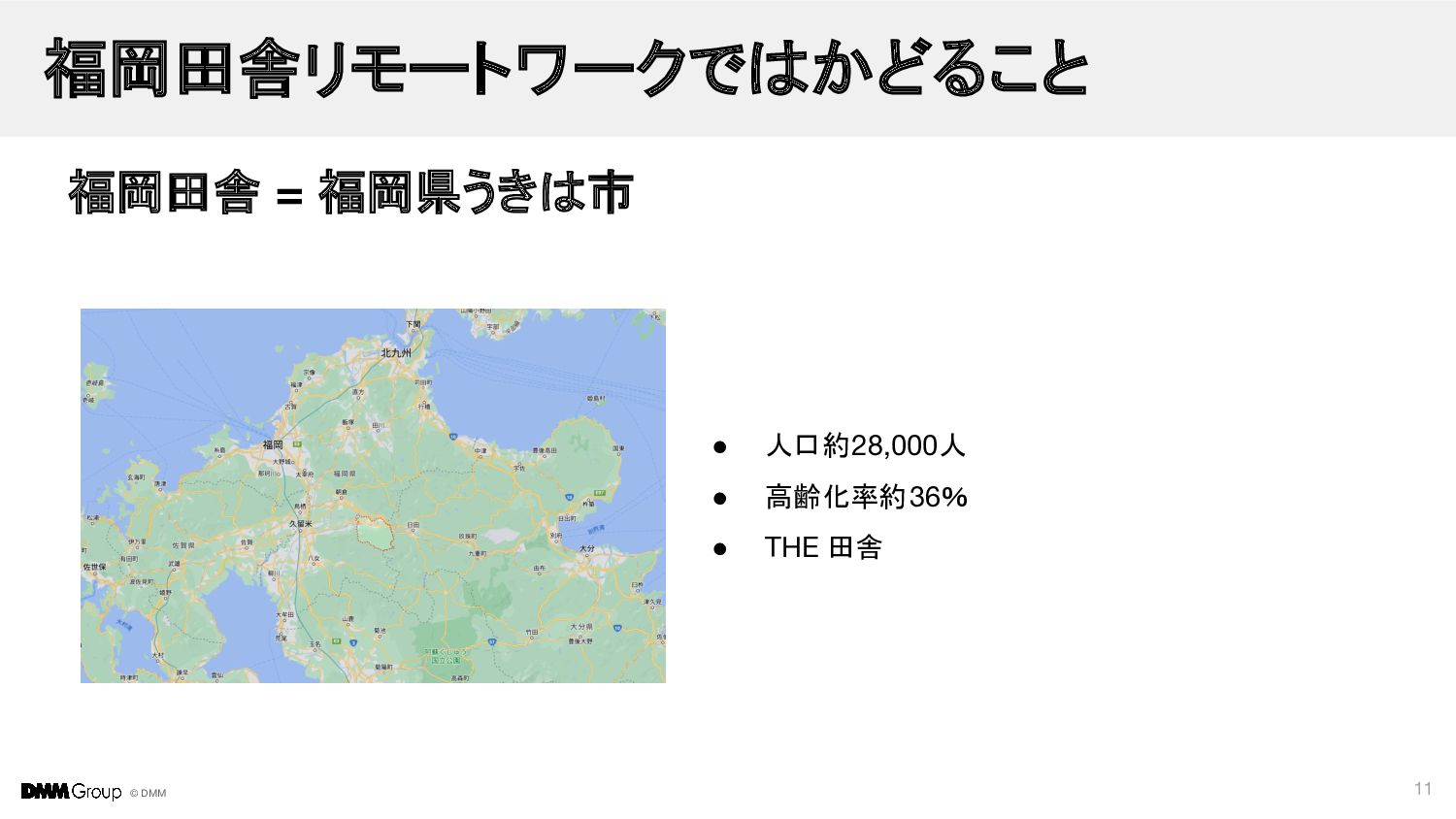 © DMM 福岡田舎リモートワークではかどること 11 福岡田舎 = 福岡県うきは市 • 人口約28,000人 •