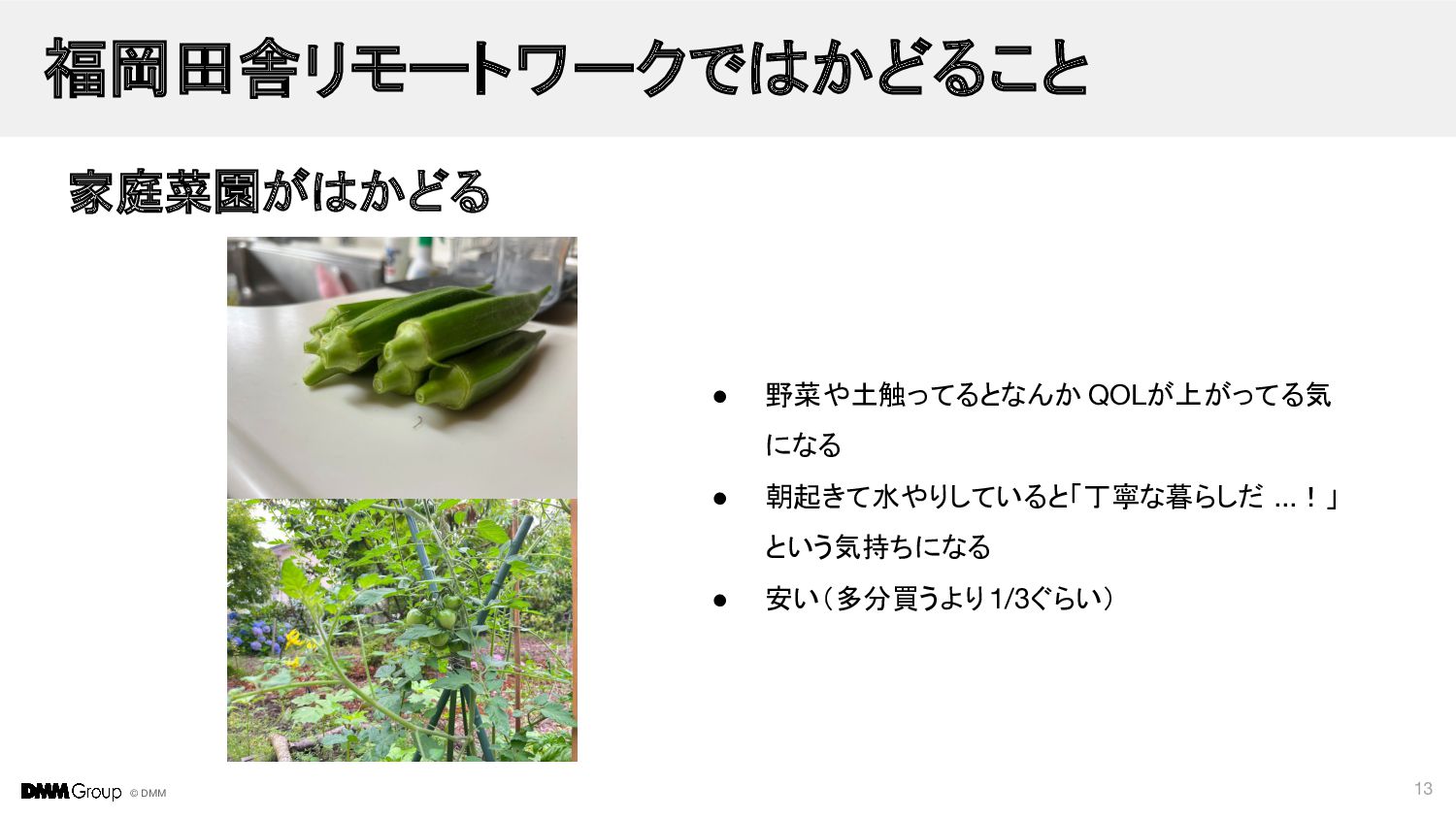 © DMM 福岡田舎リモートワークではかどること 13 家庭菜園がはかどる • 野菜や土触ってるとなんか QOLが上がってる気 になる •