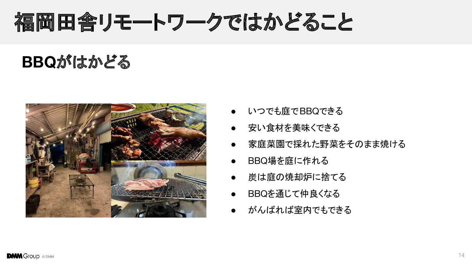 © DMM 福岡田舎リモートワークではかどること 14 BBQがはかどる • いつでも庭でBBQできる • 安い食材を美味くできる •