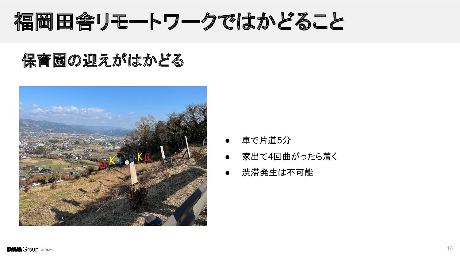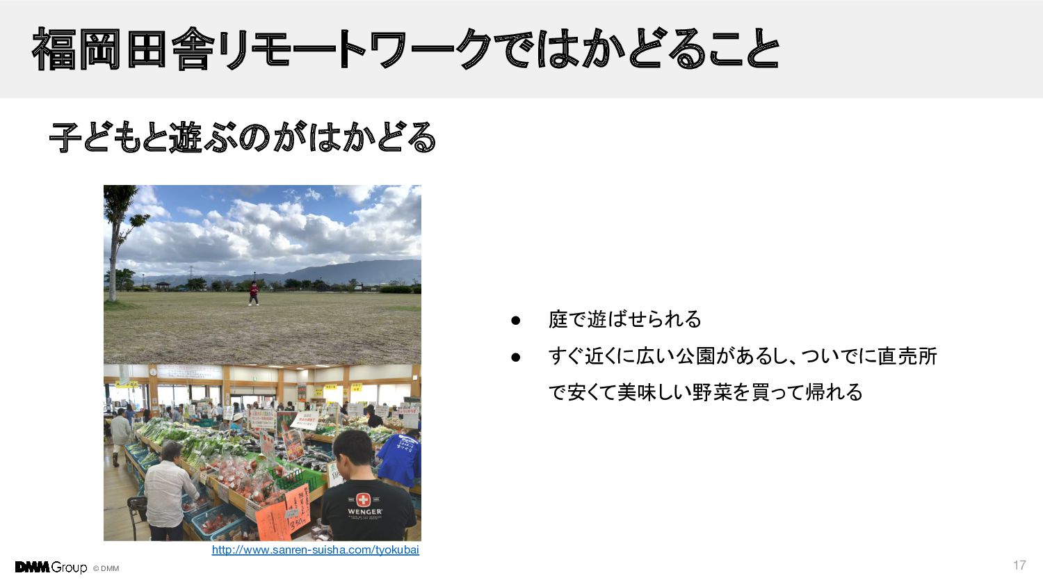 © DMM 福岡田舎リモートワークではかどること 16 保育園の迎えがはかどる • 車で片道5分 • 家出て4回曲がったら着く •