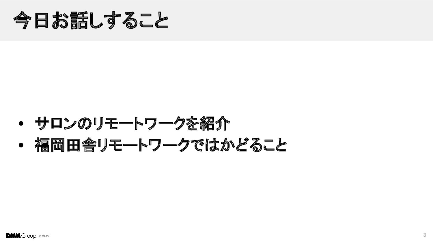 © DMM 今日お話しすること • サロンのリモートワークを紹介 • 福岡田舎リモートワークではかどること 3