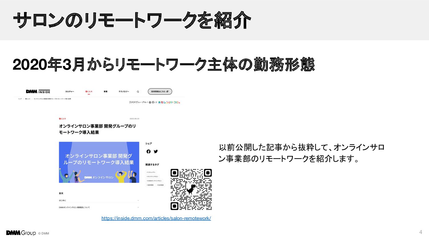 © DMM サロンのリモートワークを紹介 2020年3月からリモートワーク主体の勤務形態 4 以前公開した記事から抜粋して、オンラインサロ ン事業部のリモートワークを紹介します。 https://inside.dmm.com/articles/salon-remotework/