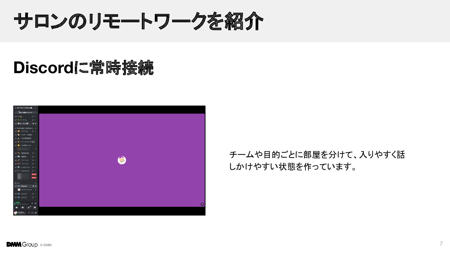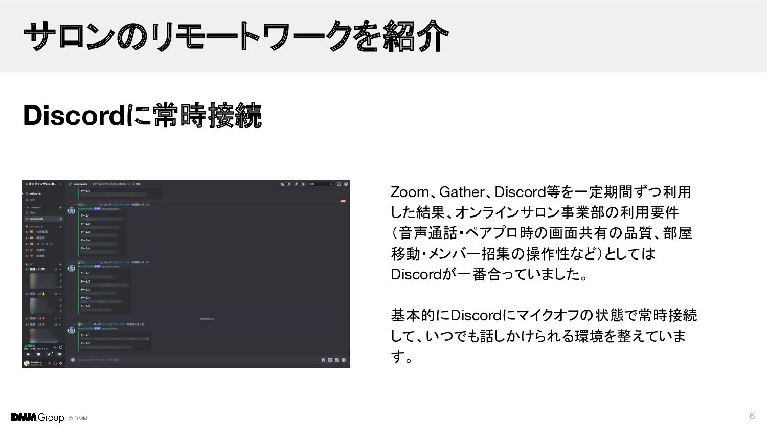 © DMM サロンのリモートワークを紹介 Discordに常時接続 6 Zoom、Gather、Discord等を一定期間ずつ利用 した結果、オンラインサロン事業部の利用要件 (音声通話・ペアプロ時の画面共有の品質、部屋 移動・メンバー招集の操作性など)としては Discordが一番合っていました。