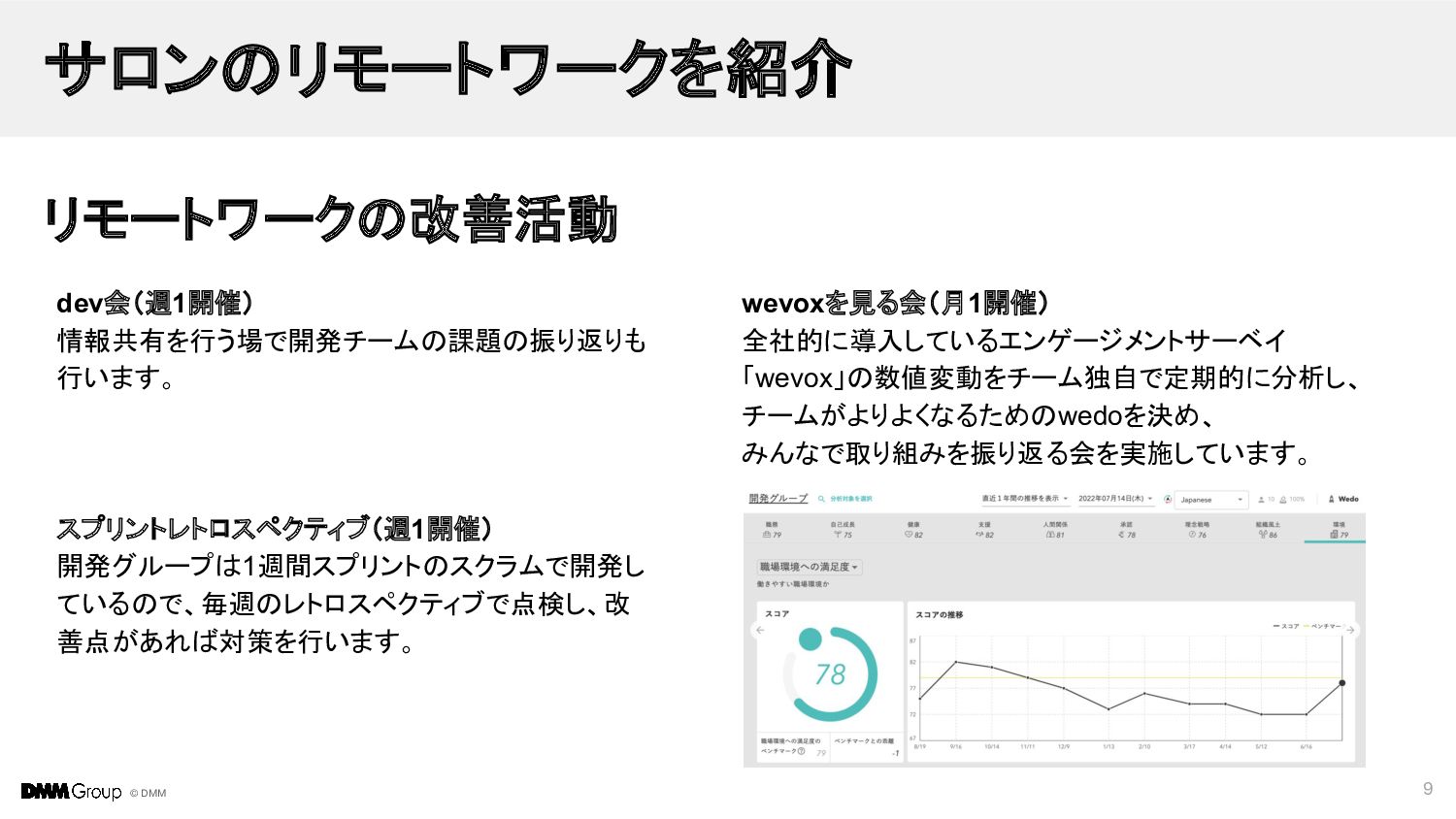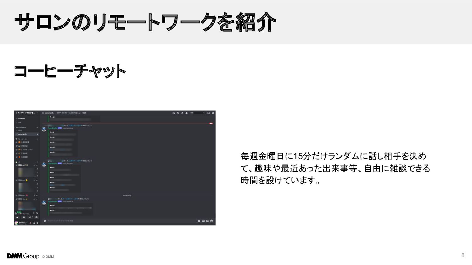 © DMM サロンのリモートワークを紹介 コーヒーチャット 8 毎週金曜日に15分だけランダムに話し相手を決め て、趣味や最近あった出来事等、自由に雑談できる 時間を設けています。