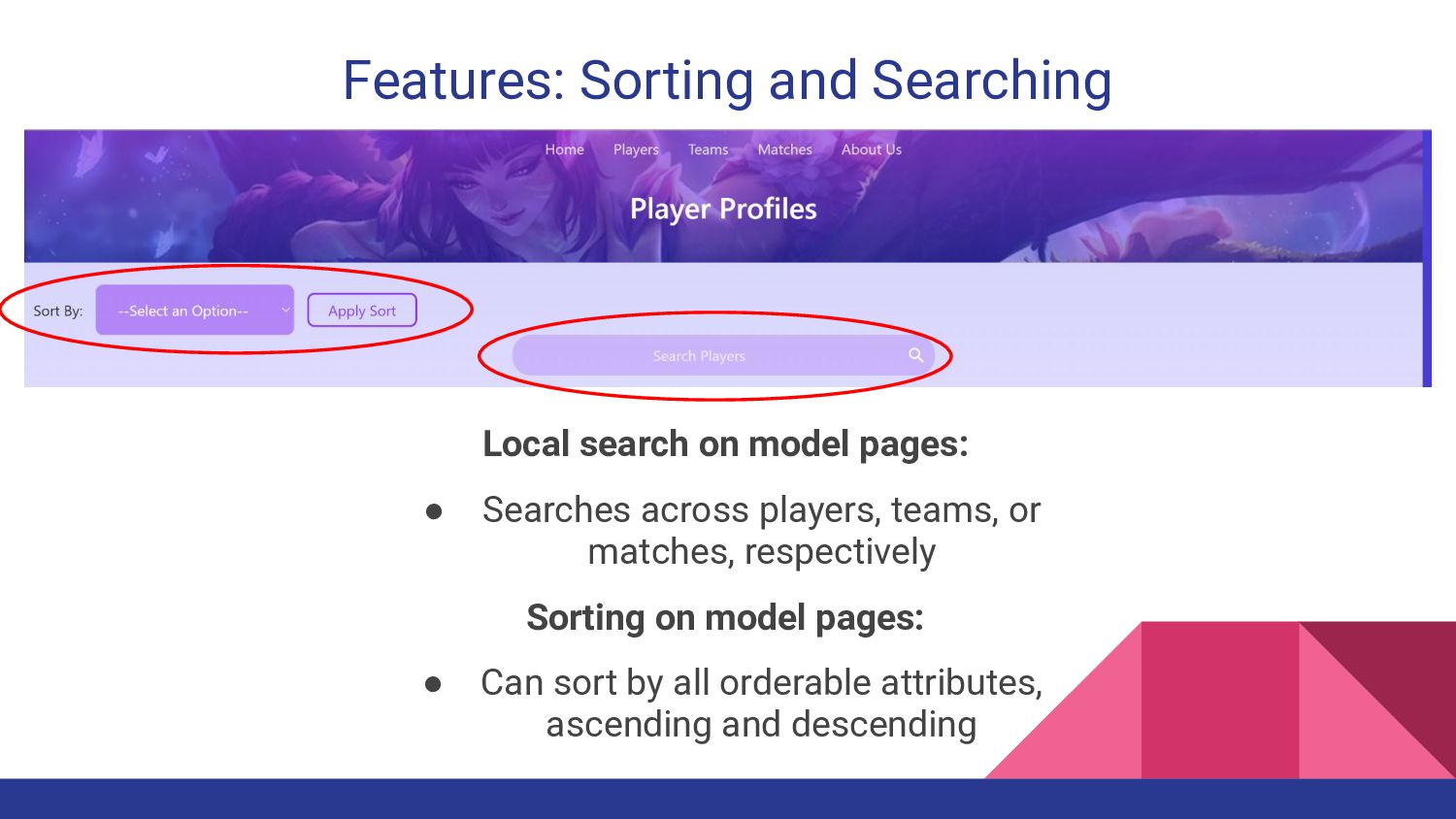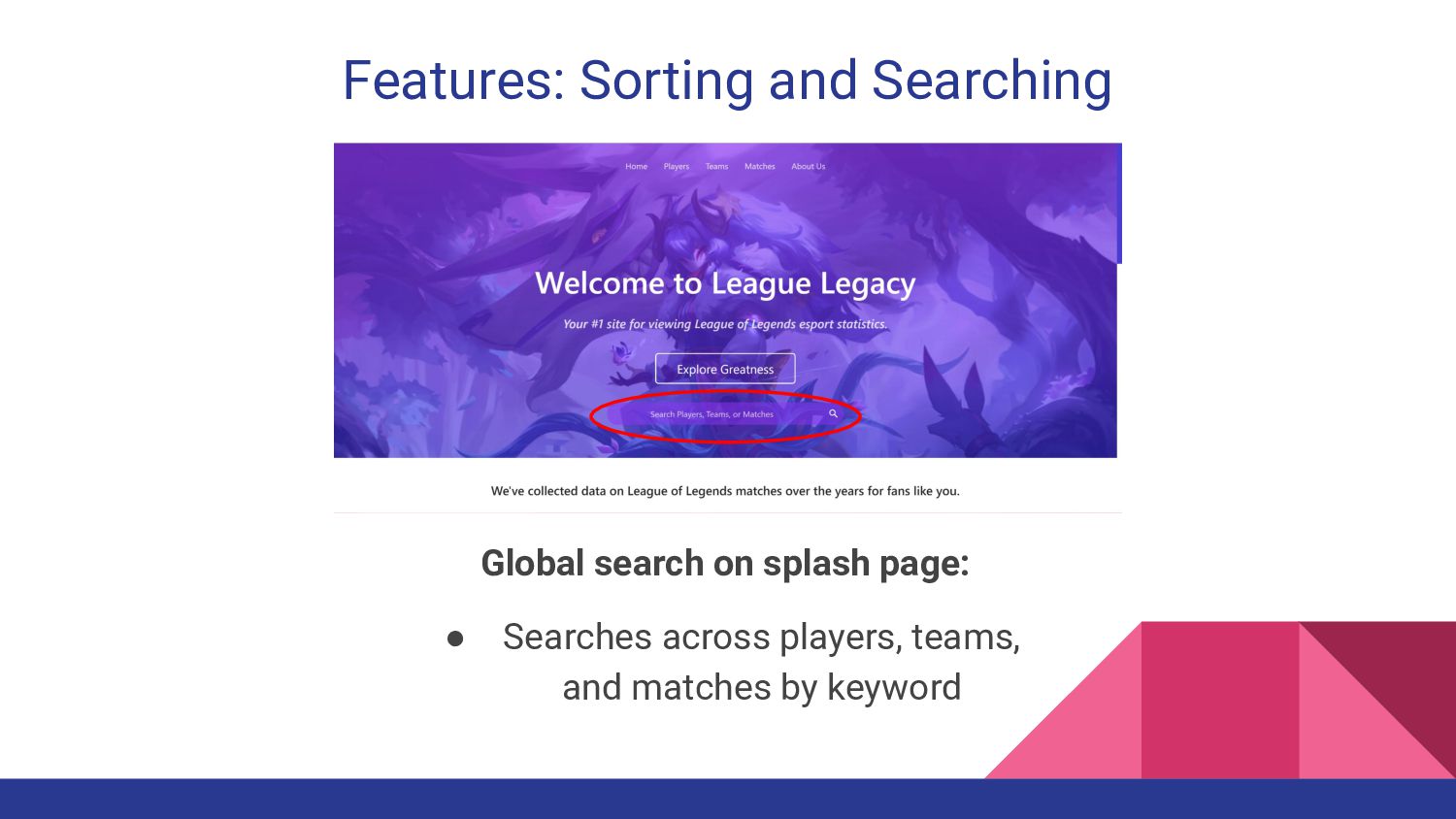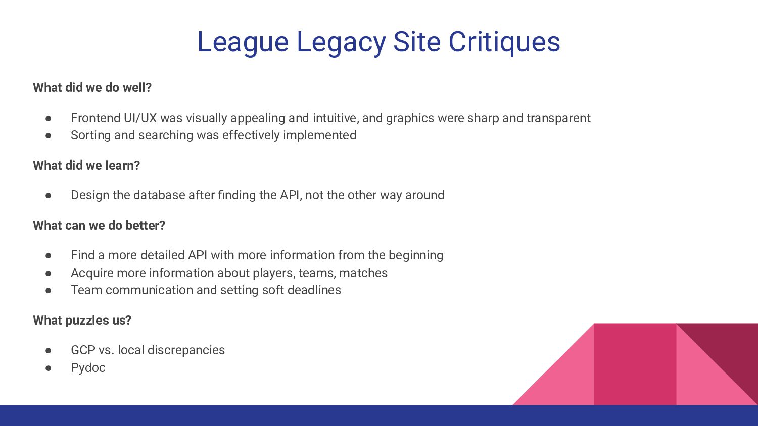 appealing and intuitive, and graphics were sharp and transparent • Sorting and searching was effectively implemented What did we learn? • Design the database after finding the API, not the other way around What can we do better? • Find a more detailed API with more information from the beginning • Acquire more information about players, teams, matches • Team communication and setting soft deadlines What puzzles us? • GCP vs. local discrepancies • Pydoc League Legacy Site Critiques