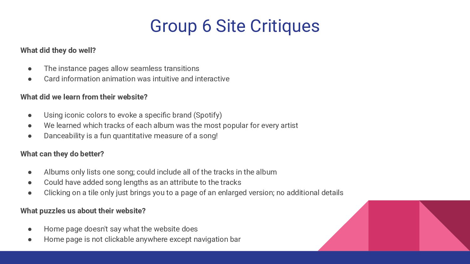 seamless transitions • Card information animation was intuitive and interactive What did we learn from their website? • Using iconic colors to evoke a specific brand (Spotify) • We learned which tracks of each album was the most popular for every artist • Danceability is a fun quantitative measure of a song! What can they do better? • Albums only lists one song; could include all of the tracks in the album • Could have added song lengths as an attribute to the tracks • Clicking on a tile only just brings you to a page of an enlarged version; no additional details What puzzles us about their website? • Home page doesn't say what the website does • Home page is not clickable anywhere except navigation bar Group 6 Site Critiques
