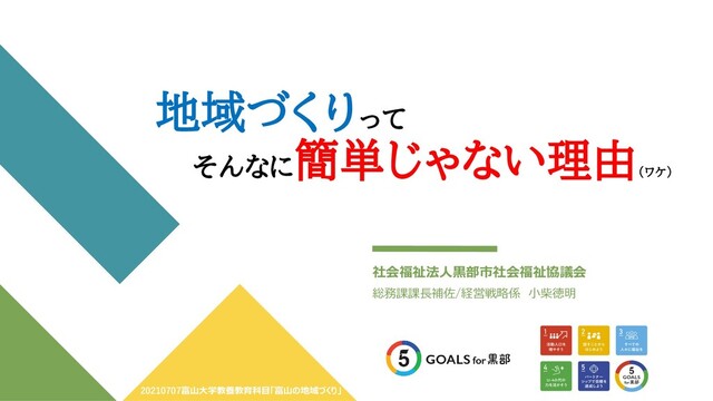 富山大学の教養教育科目 総合科目系「富山の地域づくり」全15コマの一コマで黒部市社会福祉協議会の取り組みについてお話ししました。
