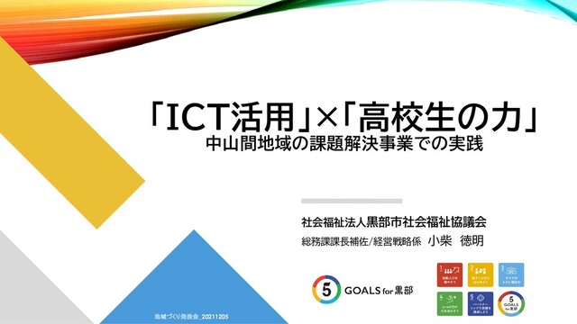 社会福祉法人黒部市社会福祉協議会 総務課課長補佐/経営戦略係 小柴 徳明 「ICT活用」×「高校生の力」 中山間地域の課題解決事業での実践 地域づくり発表会_20211205