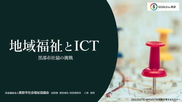 ※国立研究開発法人情報通信研究機構、株式会 社日新システムズ、黒部市社協の三者協定 【LINE botによる相談窓口】 相談のハードルを下げ、早くからの リーチをつなげるしくみ将来的な 情報発信のキーとなるしくみ 【ふくしDX】 業務効率改善を行い福祉 現場での人材不足を解消。 民間企業との共同研究PJ 【5goals for 黒部】 市民に分かりやすく伝え、みんな の目指すべきgoalを示す。 【個人活動の可視化】 社会にどう貢献したか、自分自身の活動 ログが見えるようにする。 【ふくしDXの推進基盤】 社団法人を立ち上げふくし全体のデジタ ル化、DX推進を図る組織の立ち上げ。 【SW-MaaSの開発】 トヨタモビリティ基金と福祉版移動シェア サービスの研究開発 一般社団法人 SMARTふくしラボ(予定) 福祉版移動シェアサービス SW-MaaS Social welfare Mobility as a service
