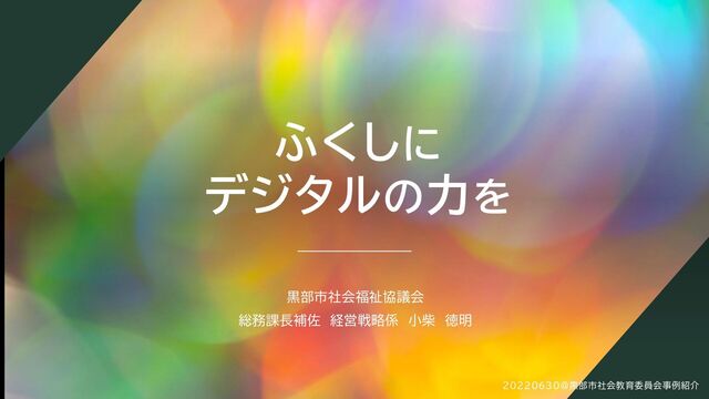 ふくしに デジタルの力を 黒部市社会福祉協議会 総務課長補佐 経営戦略係 小柴 徳明 20220630@黒部市社会教育委員会事例紹介