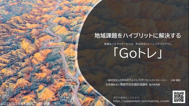 久野 (2013):新潟県見附市における健康教室参加者の医療抑制効果を参照 ※ 久野譜也:ICTと超高齢化対応の「健幸都市」-Smart Wellness Cityによる健康長寿 世界一の実現を目指して-,ICT超高齢社会構想会議第2回WG,2013年1月24日 ※ ✓ Goトレ効果検証データ ① 延べ参加者人数 :388人(黒部211人、寒河江75人、東御82人、南砺20人) ② Goトレ実施日数 :83日(黒部50日、寒河江12日、東御18日、南砺3日) ③ 延べ参加者人数の総歩数量 :864,912歩 ④ 医療費抑制効果 :52,759.6円 ( ③ ×0.061 / 歩 /日) ◆ 黒部市 :526,034歩 ⇒ 医療費抑制効果:32,088.1円 ◆ 寒河江市 :166,201歩 ⇒ 医療費抑制効果:10,138.3円 ◆ 東御市 :123,790歩 ⇒ 医療費抑制効果:7,551.2円 ◆ 南砺市 : 48,887歩 ⇒ 医療費抑制効果:2,982.1円 (参考)年間医療費抑制効果 (各都市の1回あたりの参加者平均総歩数 × 365日) ◆ 黒部市 :10,520.7歩/日 ⇒ 医療費抑制効果:3,840,048円 ◆ 寒河江市 :13,850.1歩/日 ⇒ 医療費抑制効果:5,055,280円 ◆ 東御市 : 6,877.2歩/日 ⇒ 医療費抑制効果:2,510,186円 ◆ 南砺市 :16,295.6歩/日 ⇒ 医療費抑制効果:5,947,918円 ※1 ※2 ※1 本報告書P.2で示したデータ集計対象の延べ参加者数のみ ※2 本報告書P.2で示したデータ集計対象の延べ実施日数のみ、日付被りあり Copyright © 2025 KANADERU.CO.,LTD. All Rights Reserved
