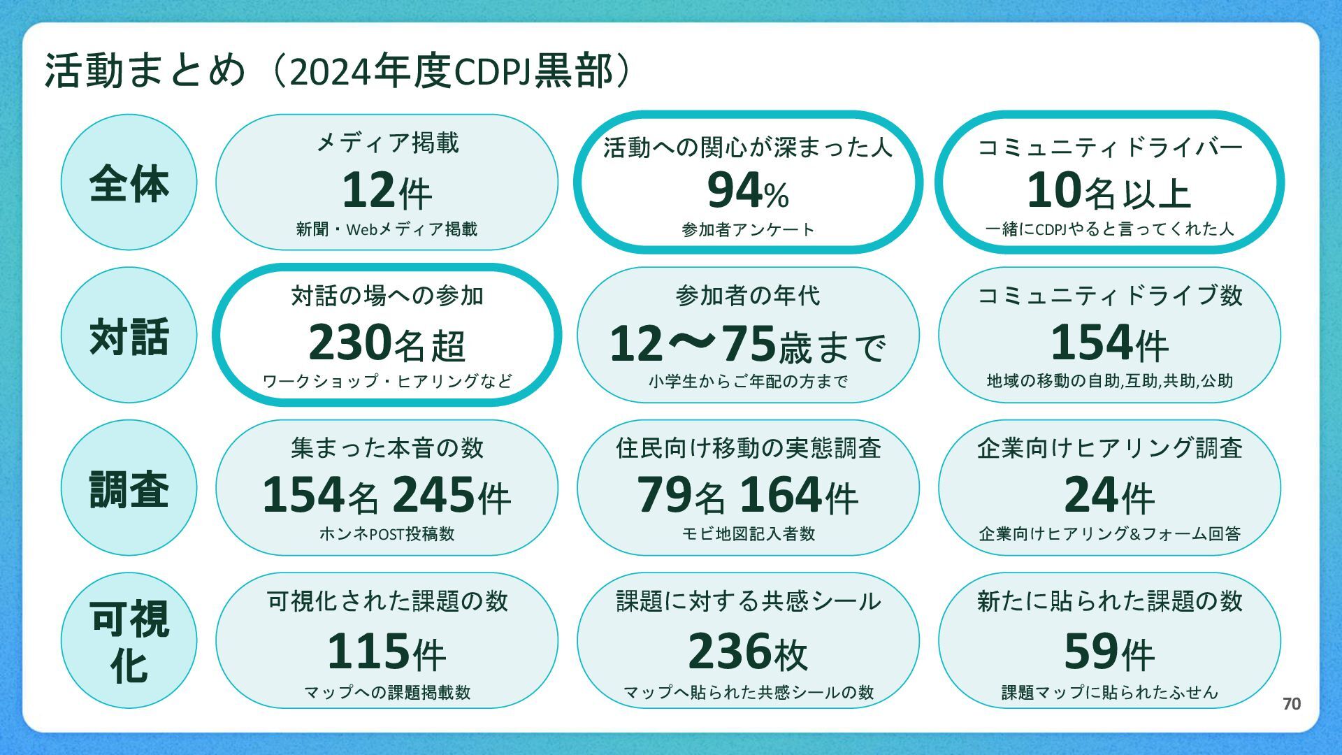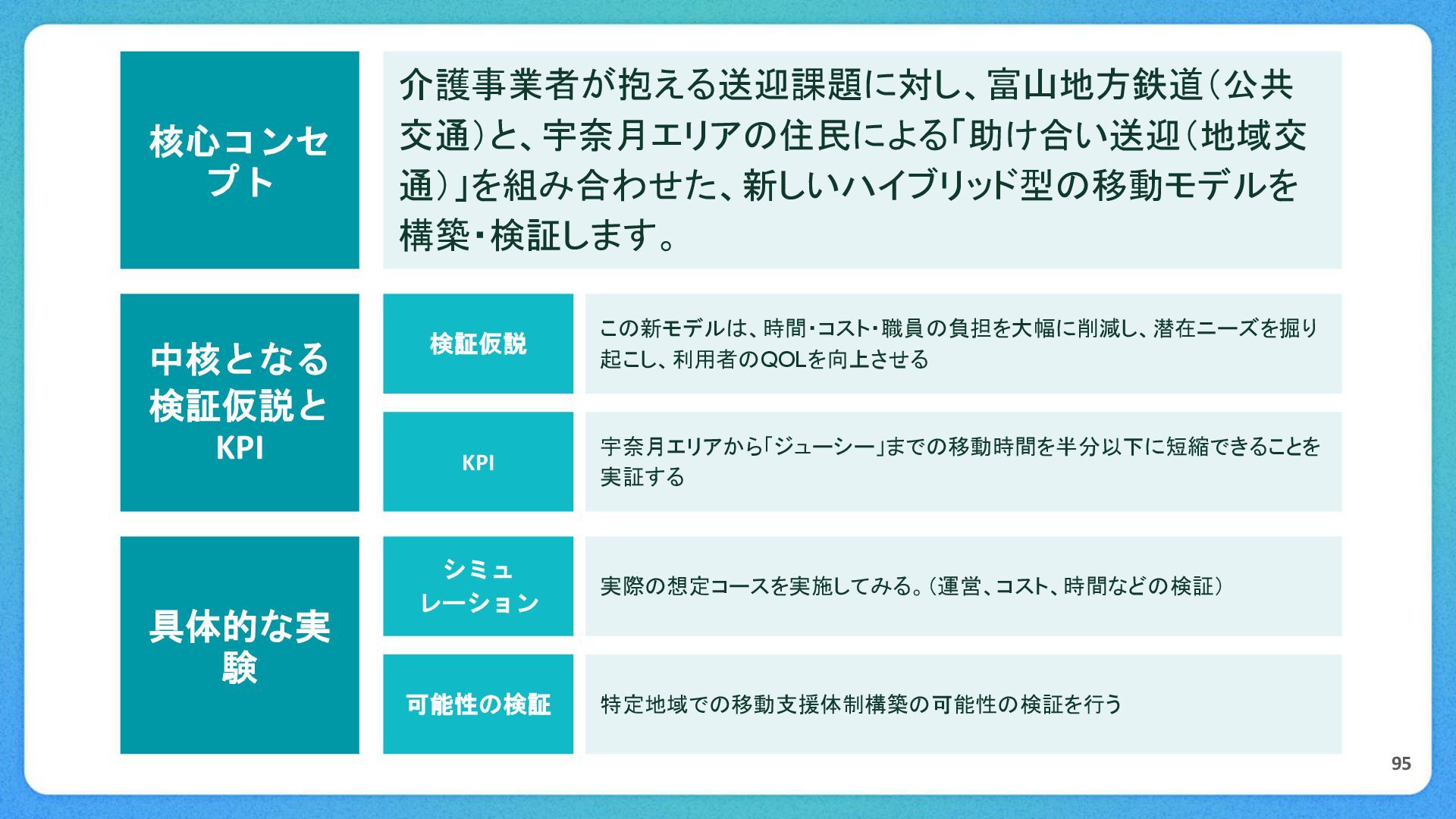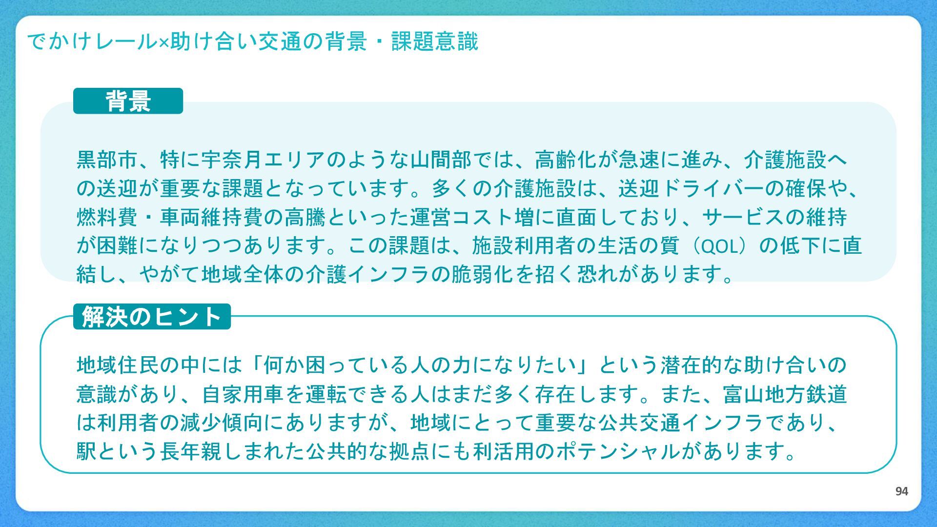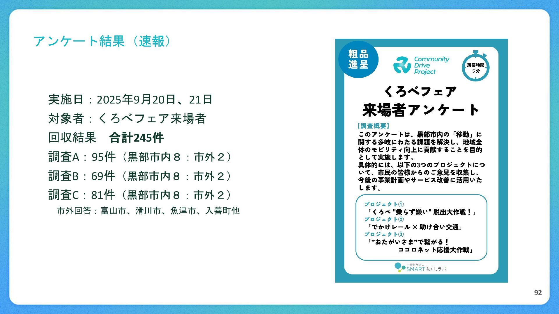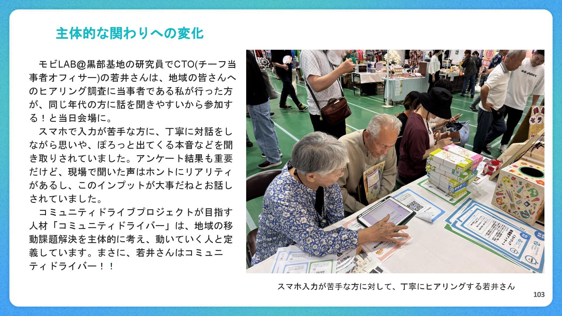久野 (2013):新潟県見附市における健康教室参加者の医療抑制効果を参照 ※ 久野譜也:ICTと超高齢化対応の「健幸都市」-Smart Wellness Cityによる健康長寿 世界一の実現を目指して-,ICT超高齢社会構想会議第2回WG,2013年1月24日 ※ ✓ Goトレ効果検証データ ① 延べ参加者人数 :388人(黒部211人、寒河江75人、東御82人、南砺20人) ② Goトレ実施日数 :83日(黒部50日、寒河江12日、東御18日、南砺3日) ③ 延べ参加者人数の総歩数量 :864,912歩 ④ 医療費抑制効果 :52,759.6円 ( ③ ×0.061 / 歩 /日) ◆ 黒部市 :526,034歩 ⇒ 医療費抑制効果:32,088.1円 ◆ 寒河江市 :166,201歩 ⇒ 医療費抑制効果:10,138.3円 ◆ 東御市 :123,790歩 ⇒ 医療費抑制効果:7,551.2円 ◆ 南砺市 : 48,887歩 ⇒ 医療費抑制効果:2,982.1円 (参考)年間医療費抑制効果 (各都市の1回あたりの参加者平均総歩数 × 365日) ◆ 黒部市 :10,520.7歩/日 ⇒ 医療費抑制効果:3,840,048円 ◆ 寒河江市 :13,850.1歩/日 ⇒ 医療費抑制効果:5,055,280円 ◆ 東御市 : 6,877.2歩/日 ⇒ 医療費抑制効果:2,510,186円 ◆ 南砺市 :16,295.6歩/日 ⇒ 医療費抑制効果:5,947,918円 ※1 ※2 ※1 本報告書P.2で示したデータ集計対象の延べ参加者数のみ ※2 本報告書P.2で示したデータ集計対象の延べ実施日数のみ、日付被りあり Copyright © 2025 KANADERU.CO.,LTD. All Rights Reserved