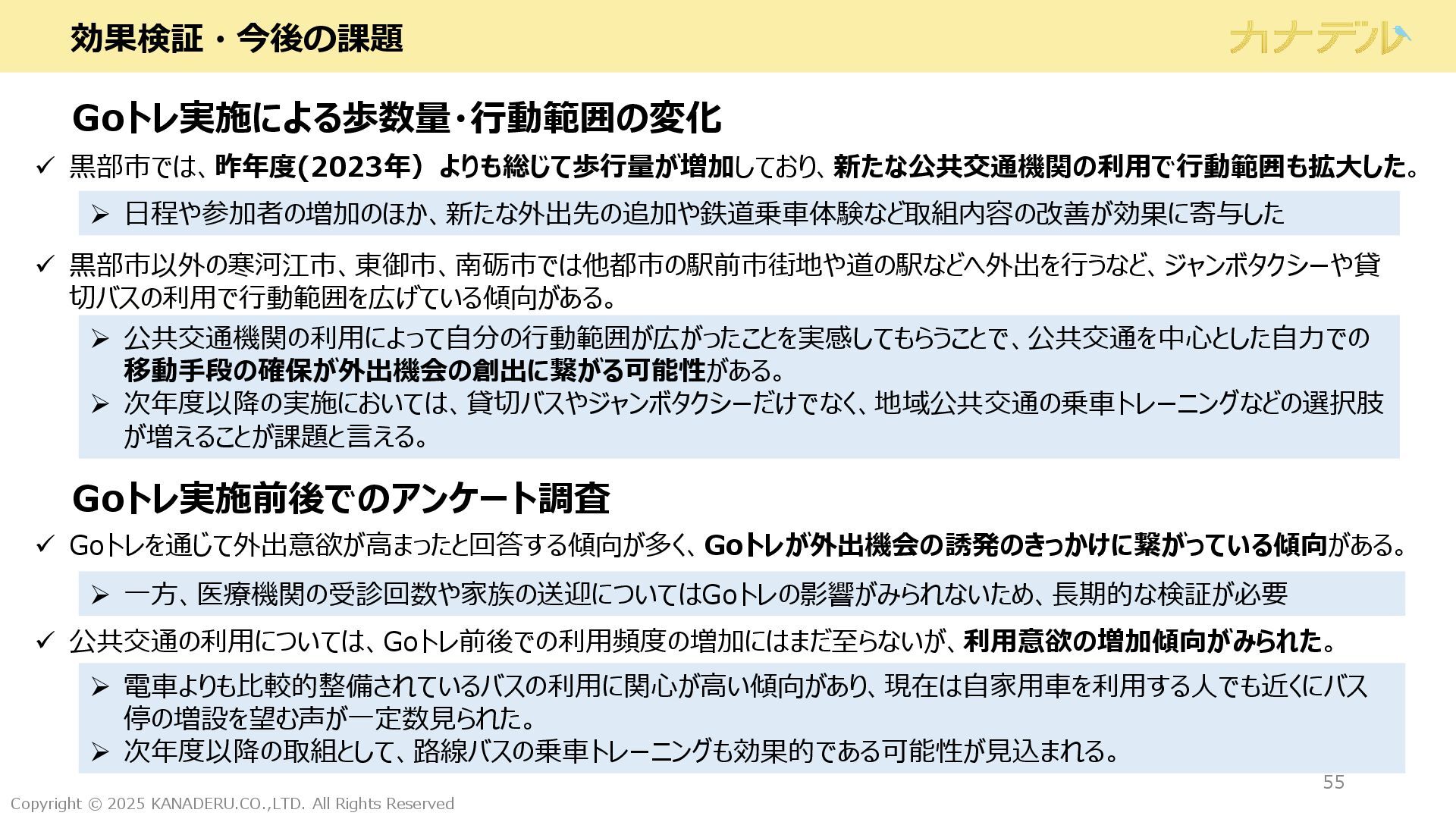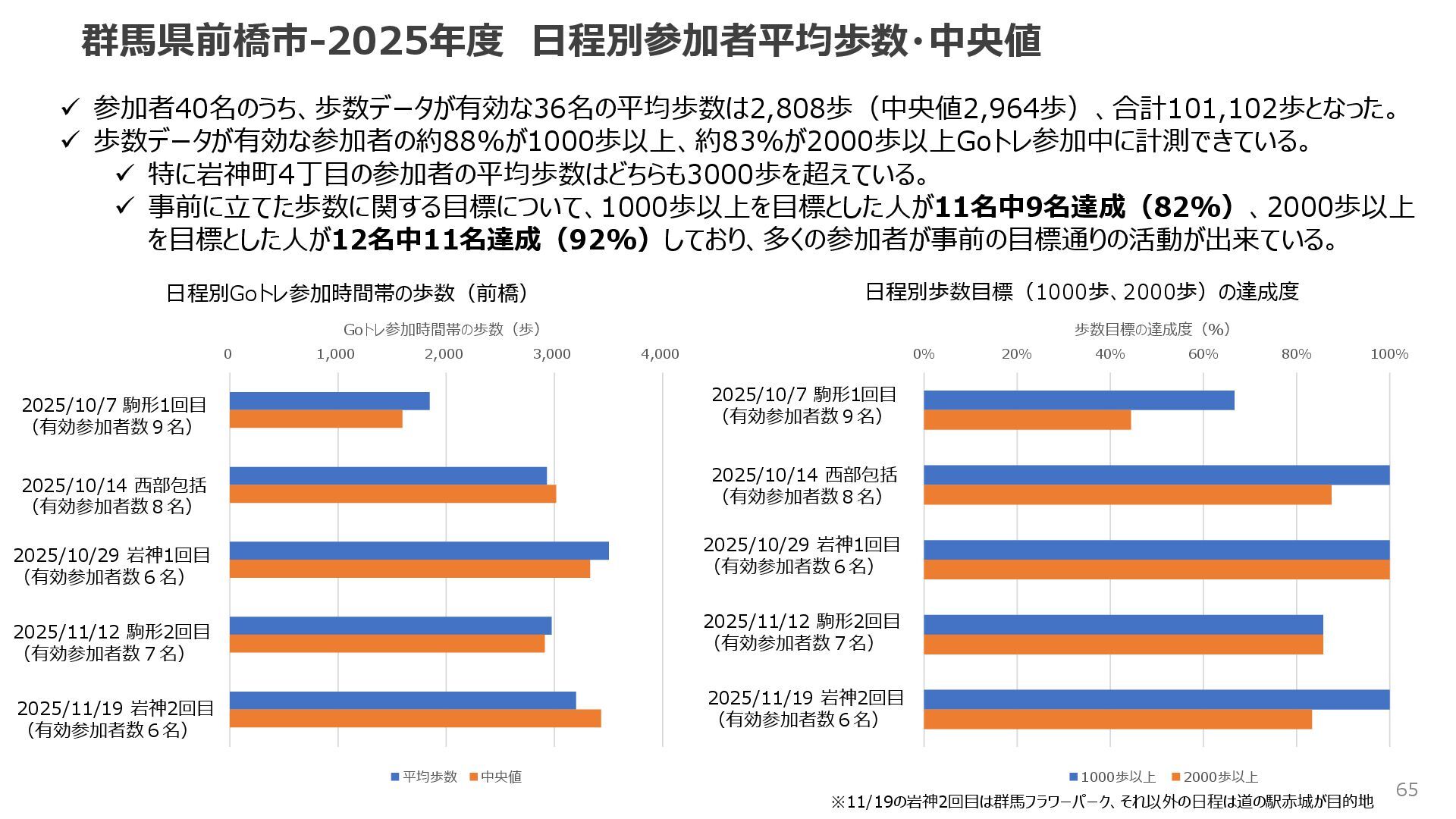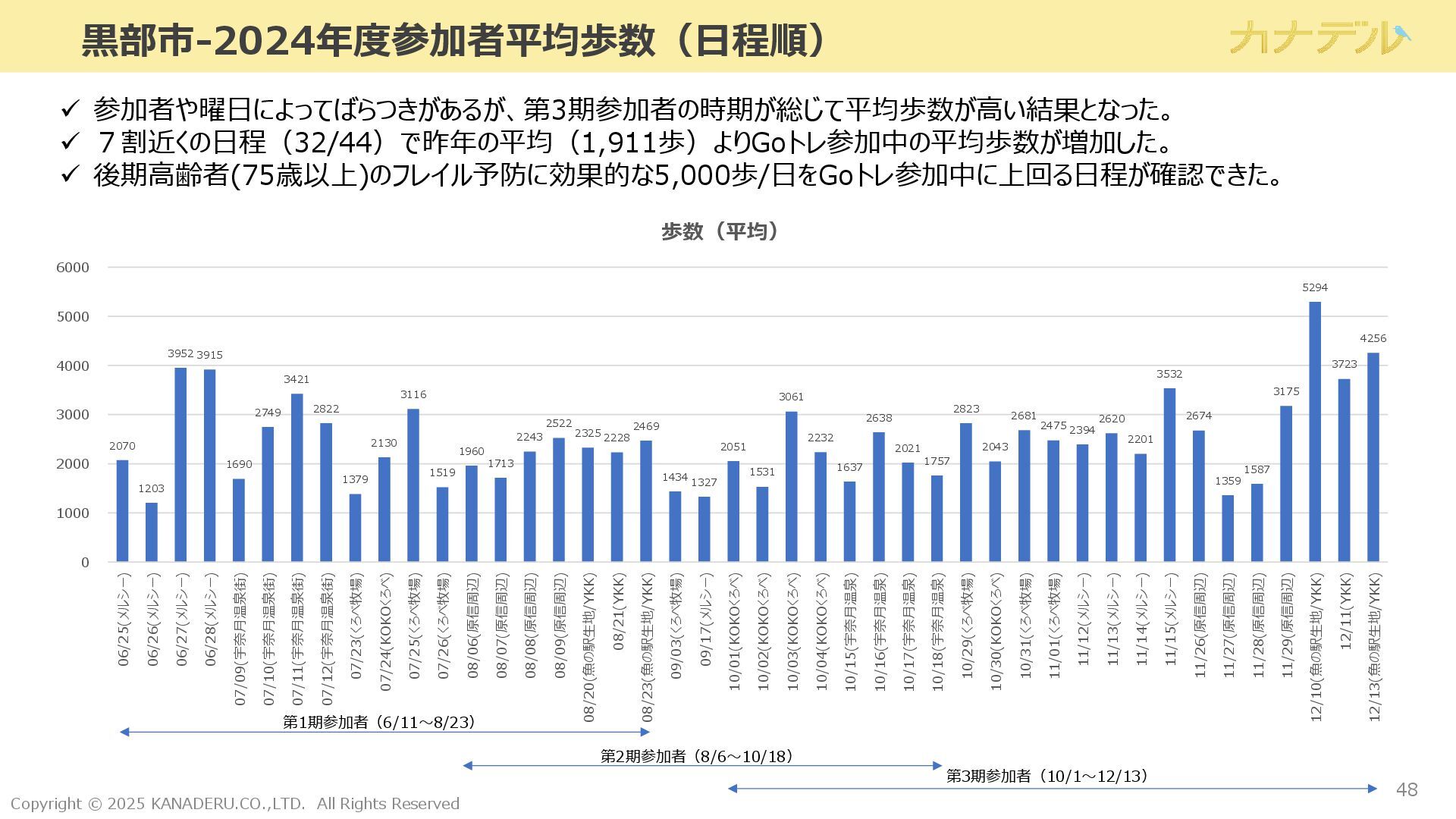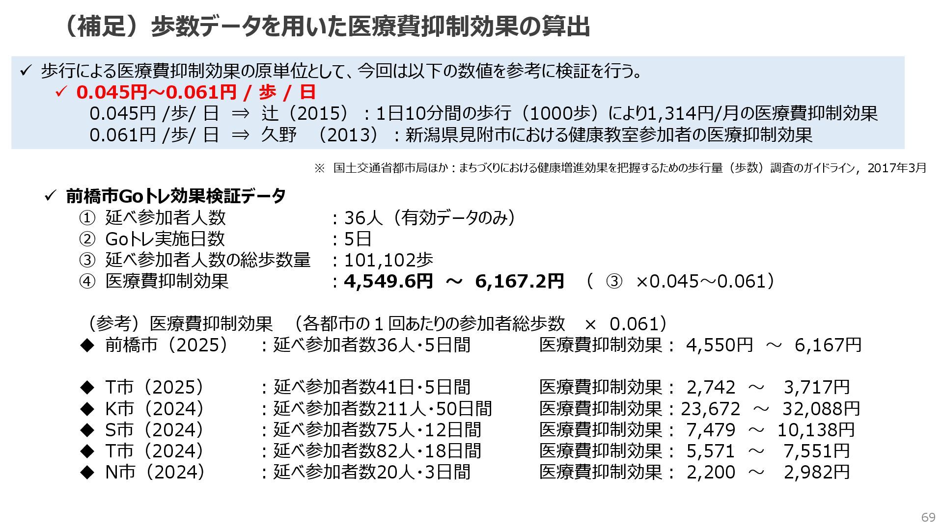 久野 (2013):新潟県見附市における健康教室参加者の医療抑制効果を参照 ※ 久野譜也:ICTと超高齢化対応の「健幸都市」-Smart Wellness Cityによる健康長寿 世界一の実現を目指して-,ICT超高齢社会構想会議第2回WG,2013年1月24日 ※ ✓ Goトレ効果検証データ ① 延べ参加者人数 :388人(黒部211人、寒河江75人、東御82人、南砺20人) ② Goトレ実施日数 :83日(黒部50日、寒河江12日、東御18日、南砺3日) ③ 延べ参加者人数の総歩数量 :864,912歩 ④ 医療費抑制効果 :52,759.6円 ( ③ ×0.061 / 歩 /日) ◆ 黒部市 :526,034歩 ⇒ 医療費抑制効果:32,088.1円 ◆ 寒河江市 :166,201歩 ⇒ 医療費抑制効果:10,138.3円 ◆ 東御市 :123,790歩 ⇒ 医療費抑制効果:7,551.2円 ◆ 南砺市 : 48,887歩 ⇒ 医療費抑制効果:2,982.1円 (参考)年間医療費抑制効果 (各都市の1回あたりの参加者平均総歩数 × 365日) ◆ 黒部市 :10,520.7歩/日 ⇒ 医療費抑制効果:3,840,048円 ◆ 寒河江市 :13,850.1歩/日 ⇒ 医療費抑制効果:5,055,280円 ◆ 東御市 : 6,877.2歩/日 ⇒ 医療費抑制効果:2,510,186円 ◆ 南砺市 :16,295.6歩/日 ⇒ 医療費抑制効果:5,947,918円 ※1 ※2 ※1 本報告書P.2で示したデータ集計対象の延べ参加者数のみ ※2 本報告書P.2で示したデータ集計対象の延べ実施日数のみ、日付被りあり Copyright © 2025 KANADERU.CO.,LTD. All Rights Reserved