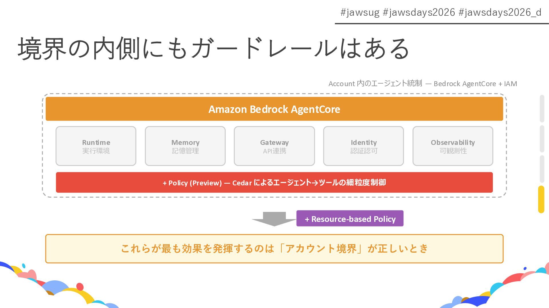 - AIエージェント時代に向けた3層の権限制御(Execution Role / Resource-based Policy / AgentCore Policy)