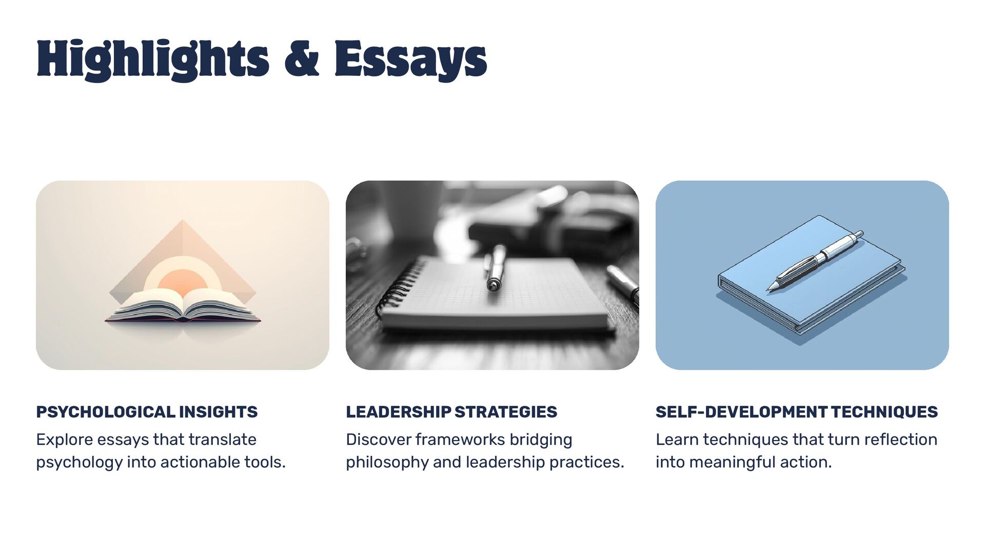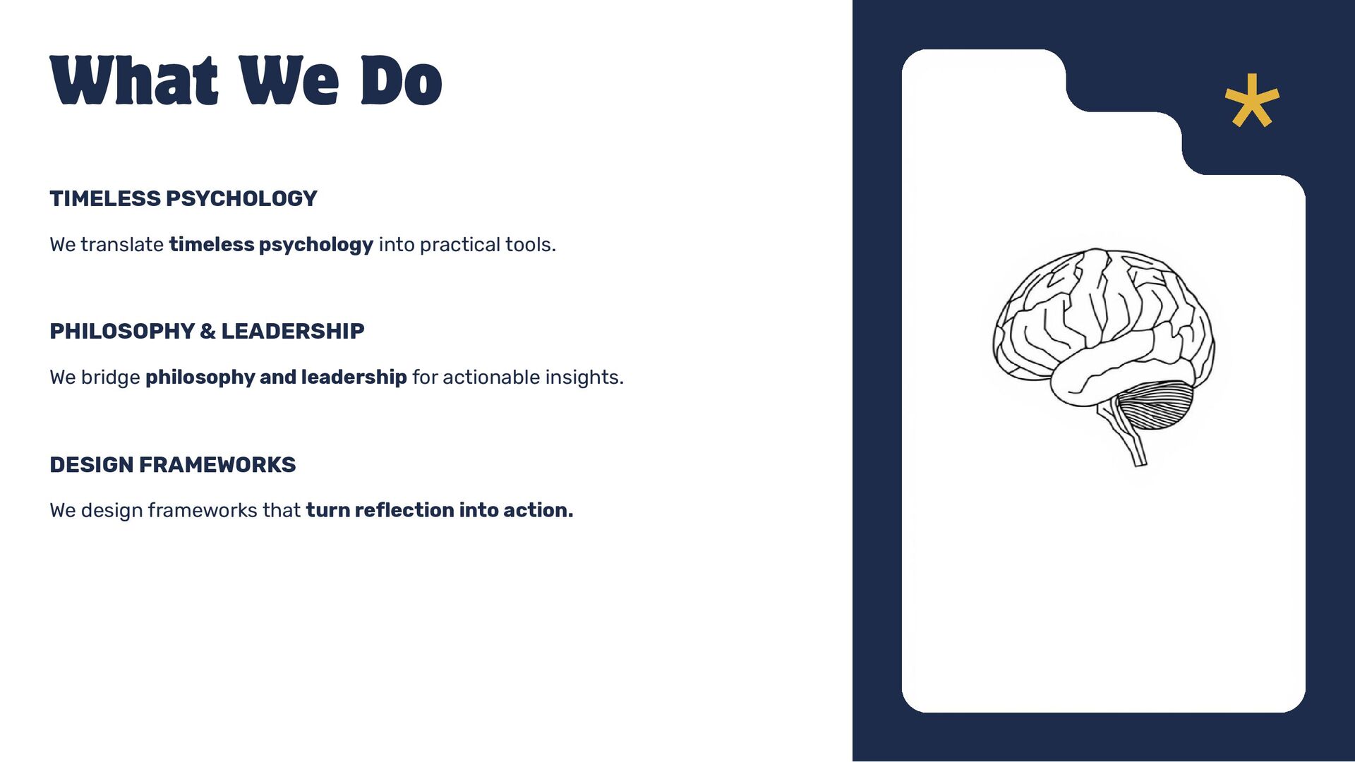 TIMELESS PSYCHOLOGY We design frameworks that turn reflection into action. DESIGN FRAMEWORKS We bridge philosophy and leadership for actionable insights. PHILOSOPHY & LEADERSHIP