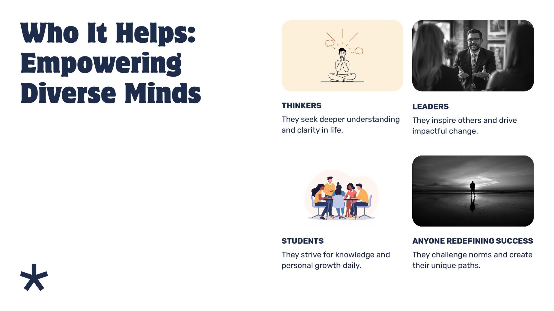 and clarity in life. THINKERS They strive for knowledge and personal growth daily. STUDENTS They inspire others and drive impactful change. LEADERS They challenge norms and create their unique paths. ANYONE REDEFINING SUCCESS