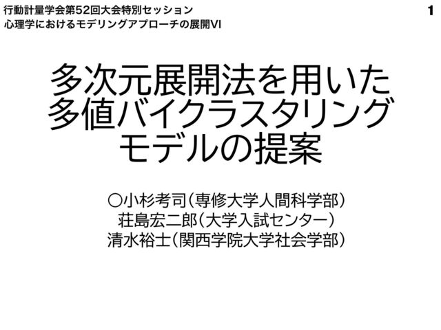 ߦಈܭྔֶձୈճେձಛผηογϣϯ ৺ཧֶʹ͓͚ΔϞσϦϯάΞϓϩʔνͷల։7* 多次元展開法を用いた 多値バイクラスタリング モデルの提案 ◦小杉考司(専修大学人間科学部) 荘島宏二郎(大学入試センター) 清水裕士(関西学院大学社会学部) 1