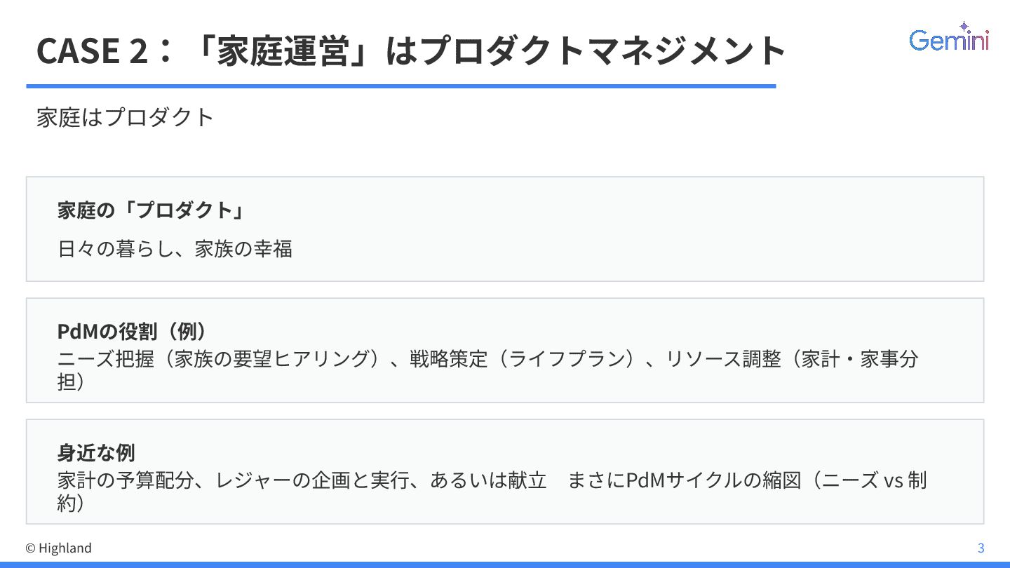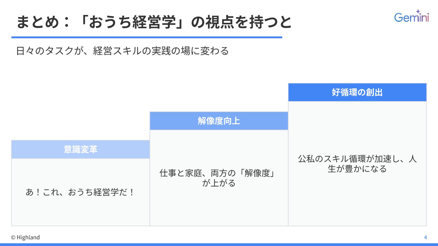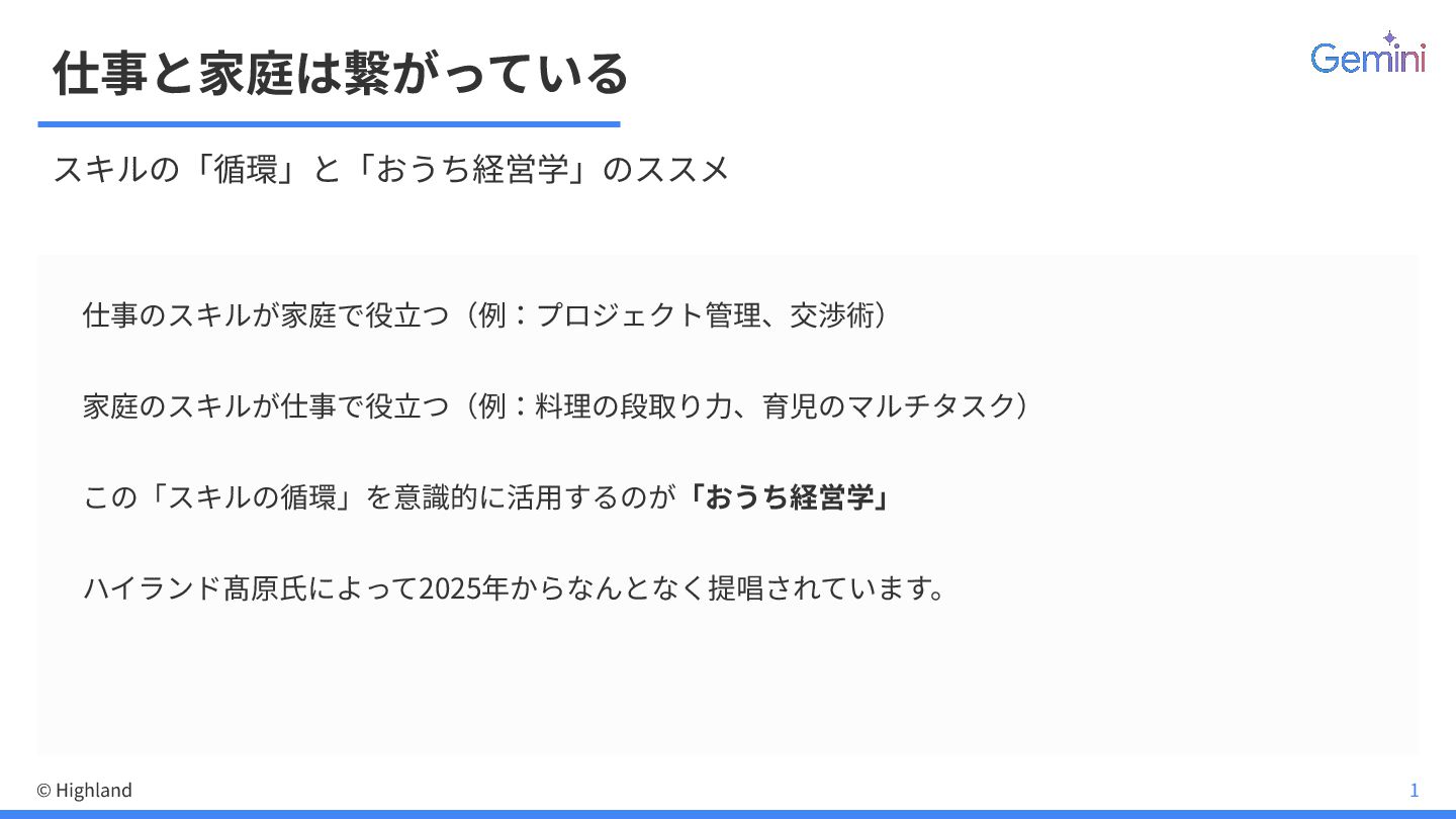 仕事と家庭は繋がっている スキルの「循環」と「おうち経営学」のススメ 仕事のスキルが家庭で役⽴つ(例:プロジェクト管理、交渉術) 家庭のスキルが仕事で役⽴つ(例:料理の段取り⼒、育児のマルチタスク) この「スキルの循環」を意識的に活⽤するのが「おうち経営学」 ハイランド髙原⽒によって2025年からなんとなく提唱されています。 © Highland 1