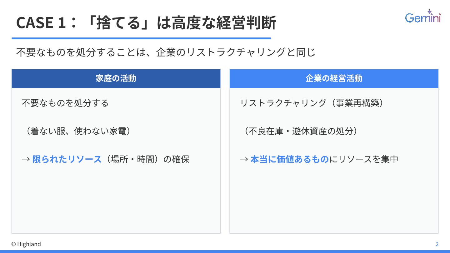 CASE 1:「捨てる」は⾼度な経営判断 不要なものを処分することは、企業のリストラクチャリングと同じ 家庭の活動 不要なものを処分する (着ない服、使わない家電) → 限られたリソース(場所‧時間)の確保 企業の経営活動 リストラクチャリング(事業再構築)