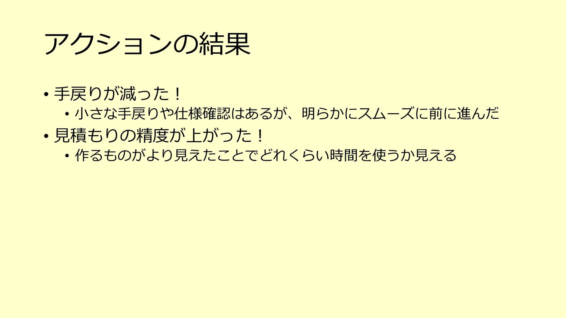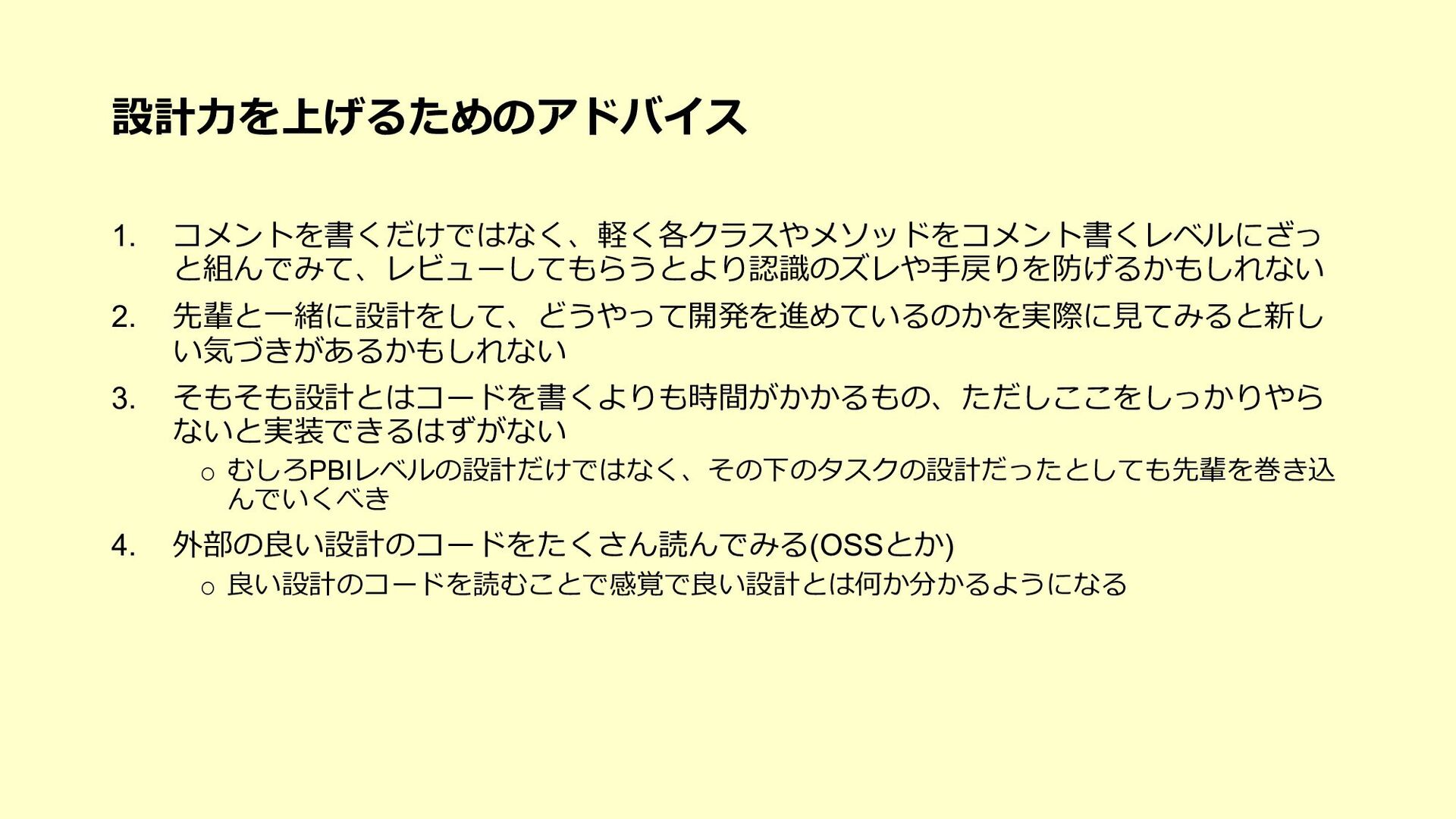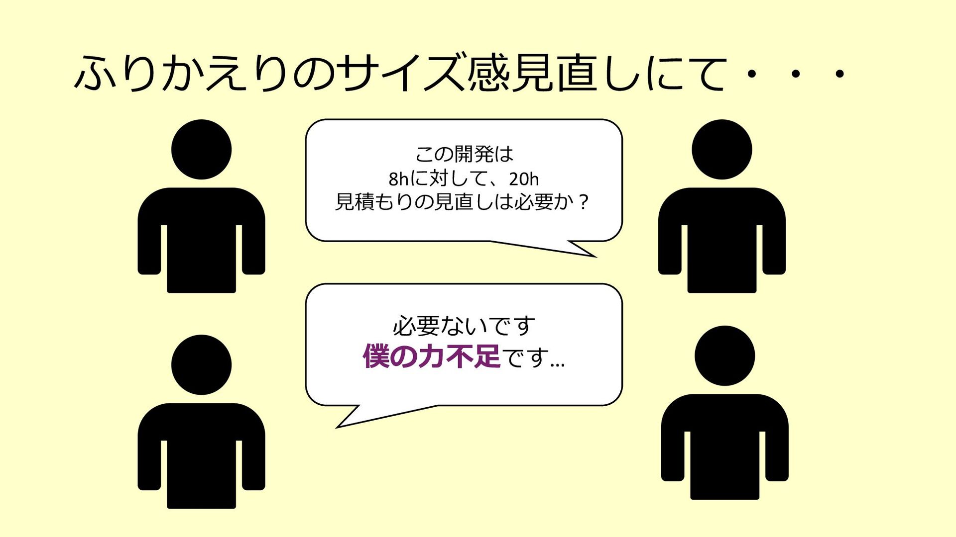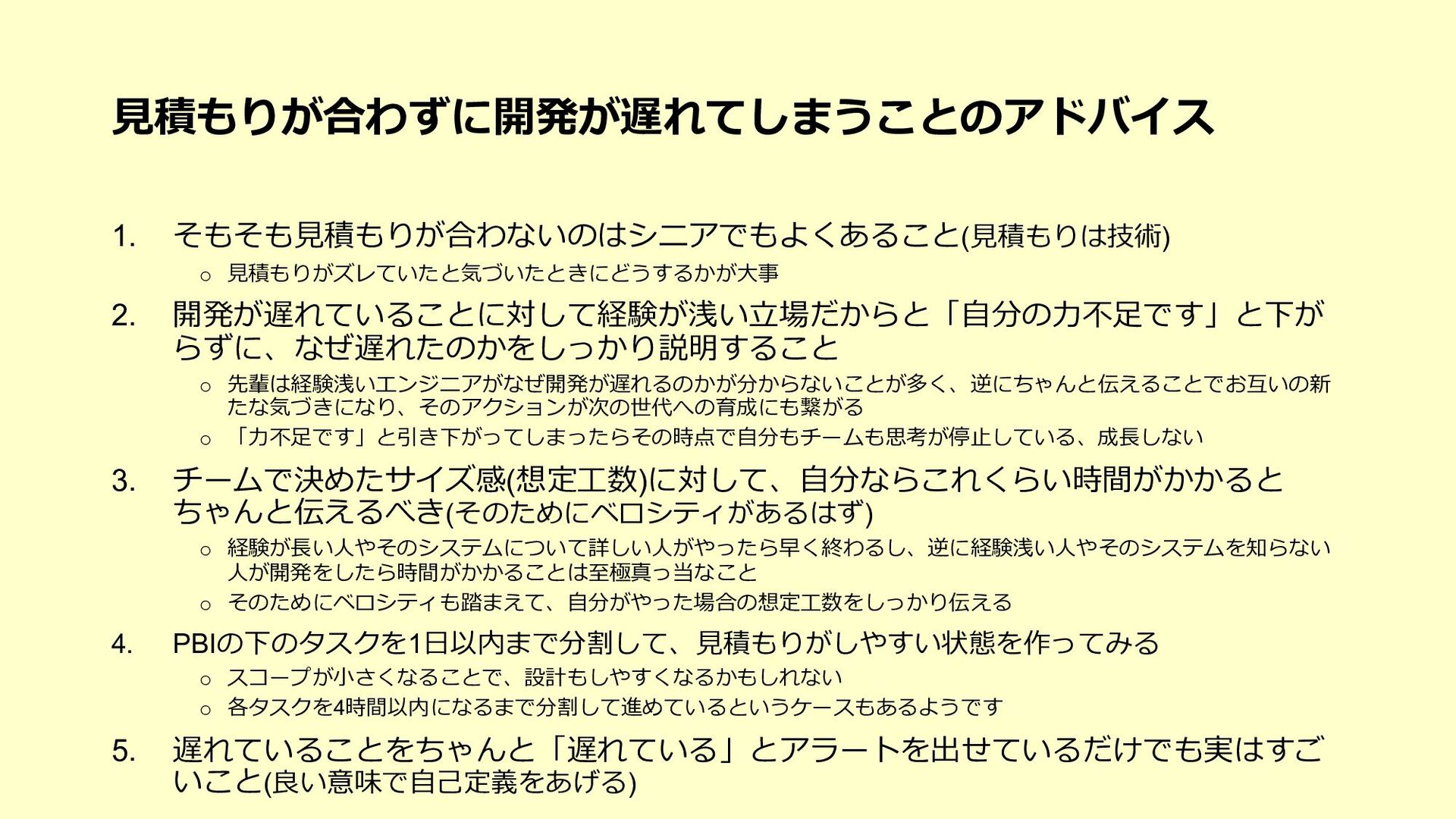 たな気づきになり、そのアクションが次の世代への育成にも繋がる o 「⼒不⾜です」と引き下がってしまったらその時点で⾃分もチームも思考が停⽌している、成⻑しない 3. チームで決めたサイズ感(想定⼯数)に対して、⾃分ならこれくらい時間がかかると ちゃんと伝えるべき(そのためにベロシティがあるはず) o 経験が⻑い⼈やそのシステムについて詳しい⼈がやったら早く終わるし、逆に経験浅い⼈やそのシステムを知らない ⼈が開発をしたら時間がかかることは⾄極真っ当なこと o そのためにベロシティも踏まえて、⾃分がやった場合の想定⼯数をしっかり伝える 4. PBIの下のタスクを1⽇以内まで分割して、⾒積もりがしやすい状態を作ってみる o スコープが⼩さくなることで、設計もしやすくなるかもしれない o 各タスクを4時間以内になるまで分割して進めているというケースもあるようです 5. 遅れていることをちゃんと「遅れている」とアラートを出せているだけでも実はすご いこと(良い意味で⾃⼰定義をあげる)