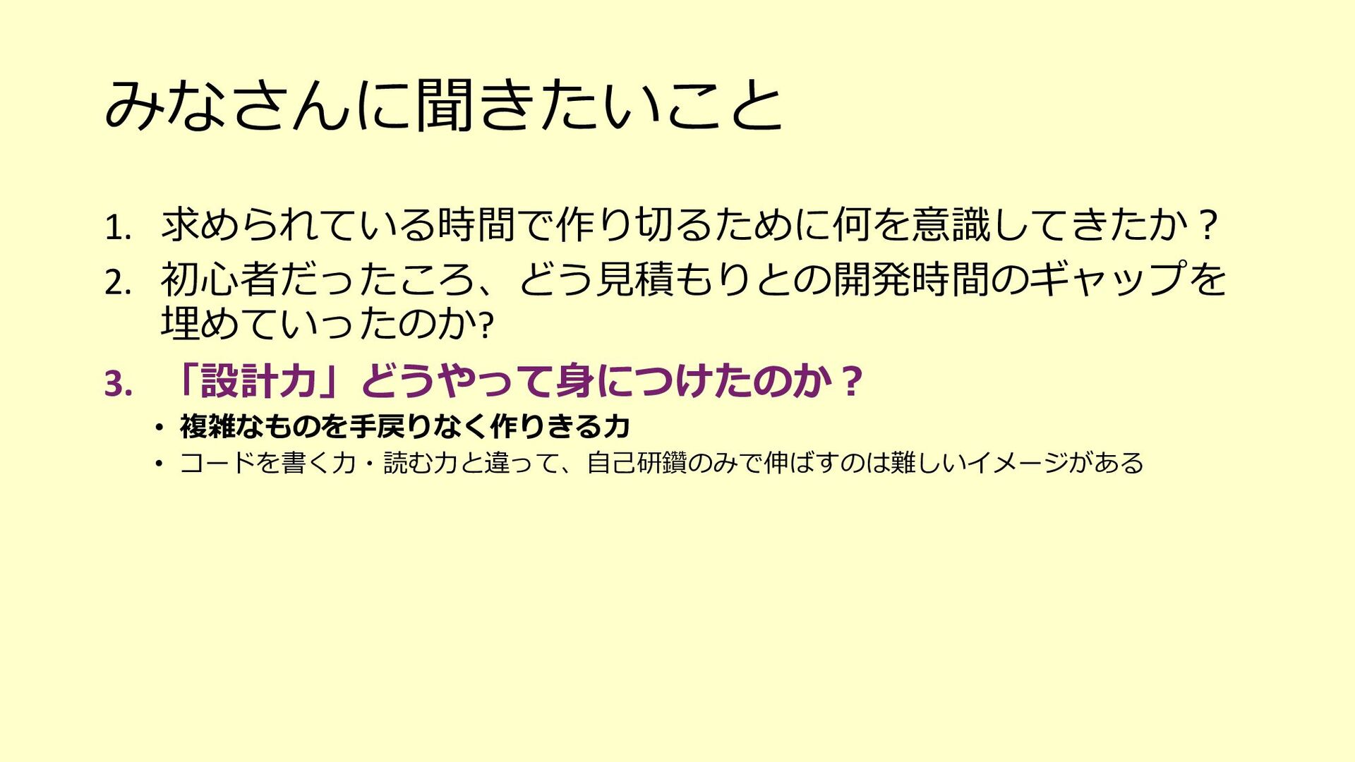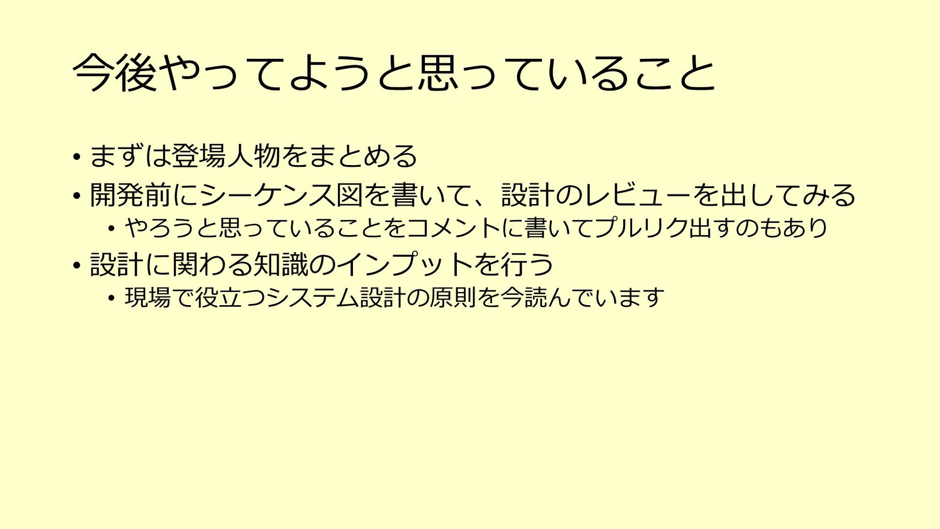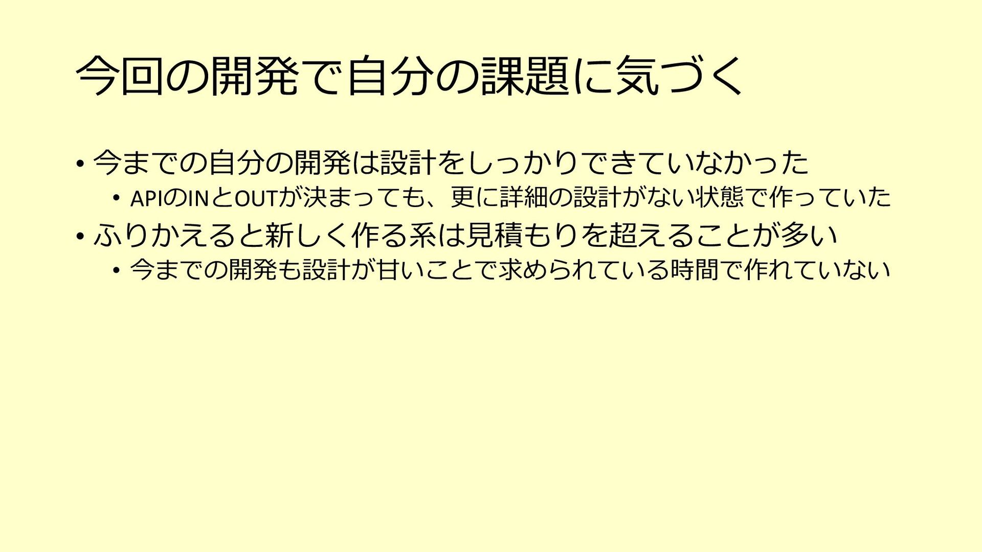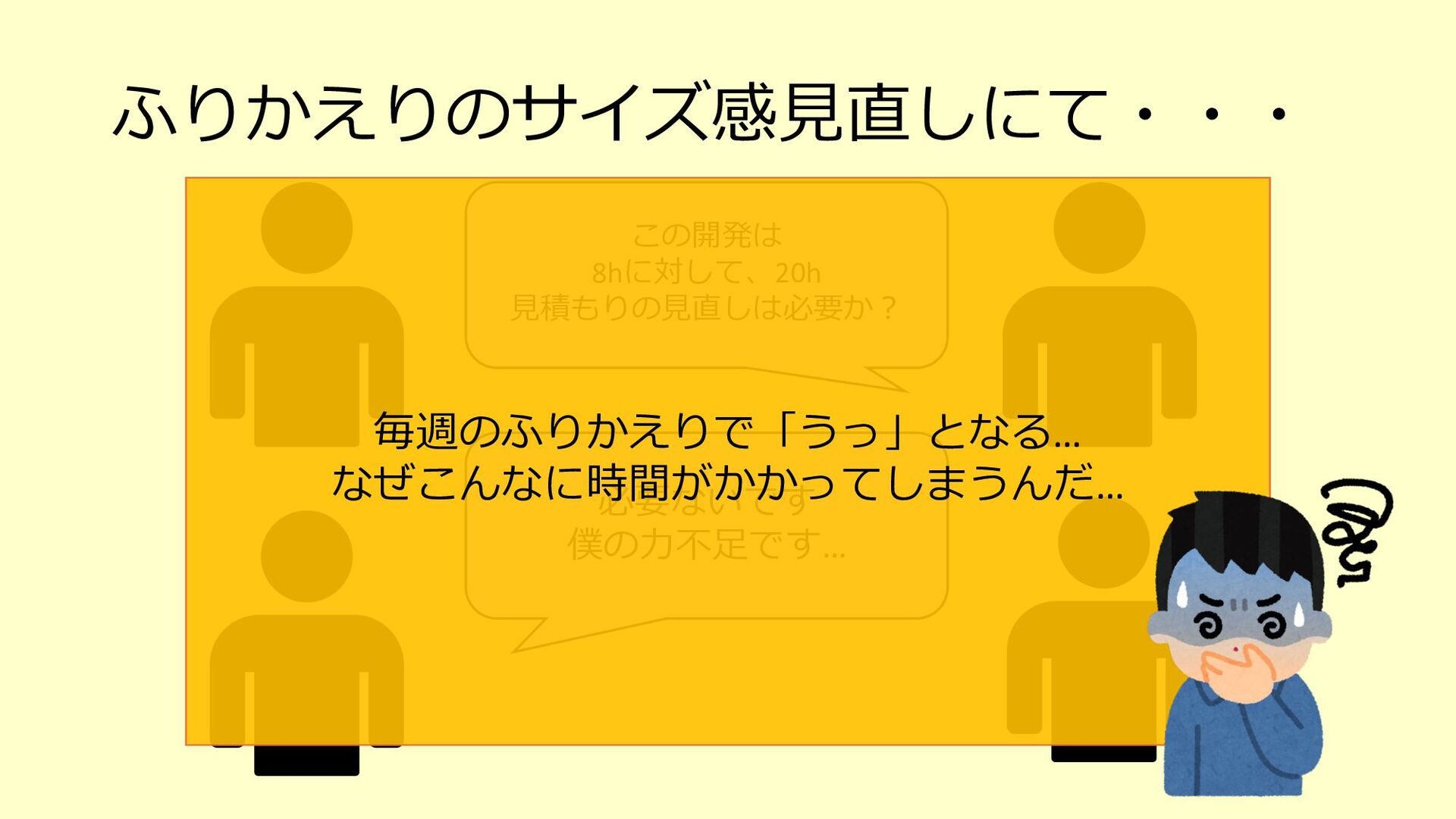 たな気づきになり、そのアクションが次の世代への育成にも繋がる o 「⼒不⾜です」と引き下がってしまったらその時点で⾃分もチームも思考が停⽌している、成⻑しない 3. チームで決めたサイズ感(想定⼯数)に対して、⾃分ならこれくらい時間がかかると ちゃんと伝えるべき(そのためにベロシティがあるはず) o 経験が⻑い⼈やそのシステムについて詳しい⼈がやったら早く終わるし、逆に経験浅い⼈やそのシステムを知らない ⼈が開発をしたら時間がかかることは⾄極真っ当なこと o そのためにベロシティも踏まえて、⾃分がやった場合の想定⼯数をしっかり伝える 4. PBIの下のタスクを1⽇以内まで分割して、⾒積もりがしやすい状態を作ってみる o スコープが⼩さくなることで、設計もしやすくなるかもしれない o 各タスクを4時間以内になるまで分割して進めているというケースもあるようです 5. 遅れていることをちゃんと「遅れている」とアラートを出せているだけでも実はすご いこと(良い意味で⾃⼰定義をあげる)