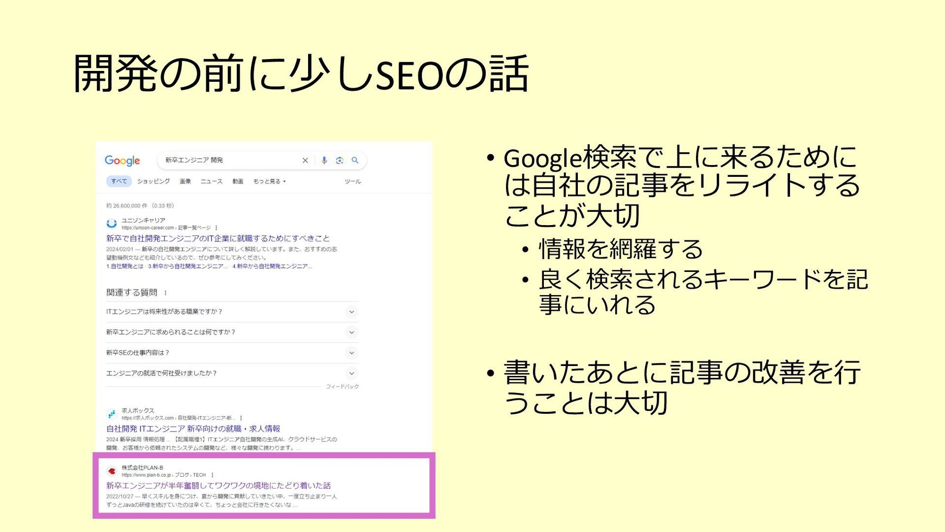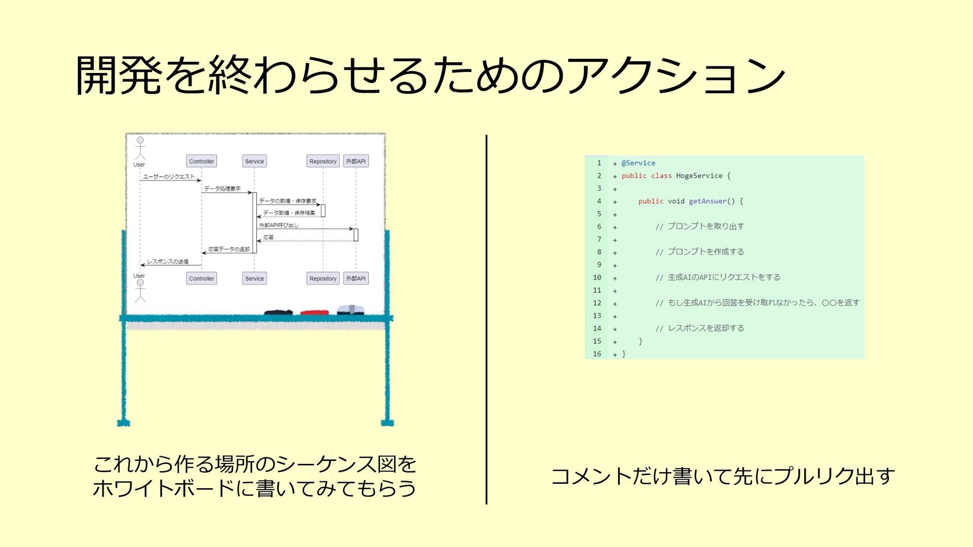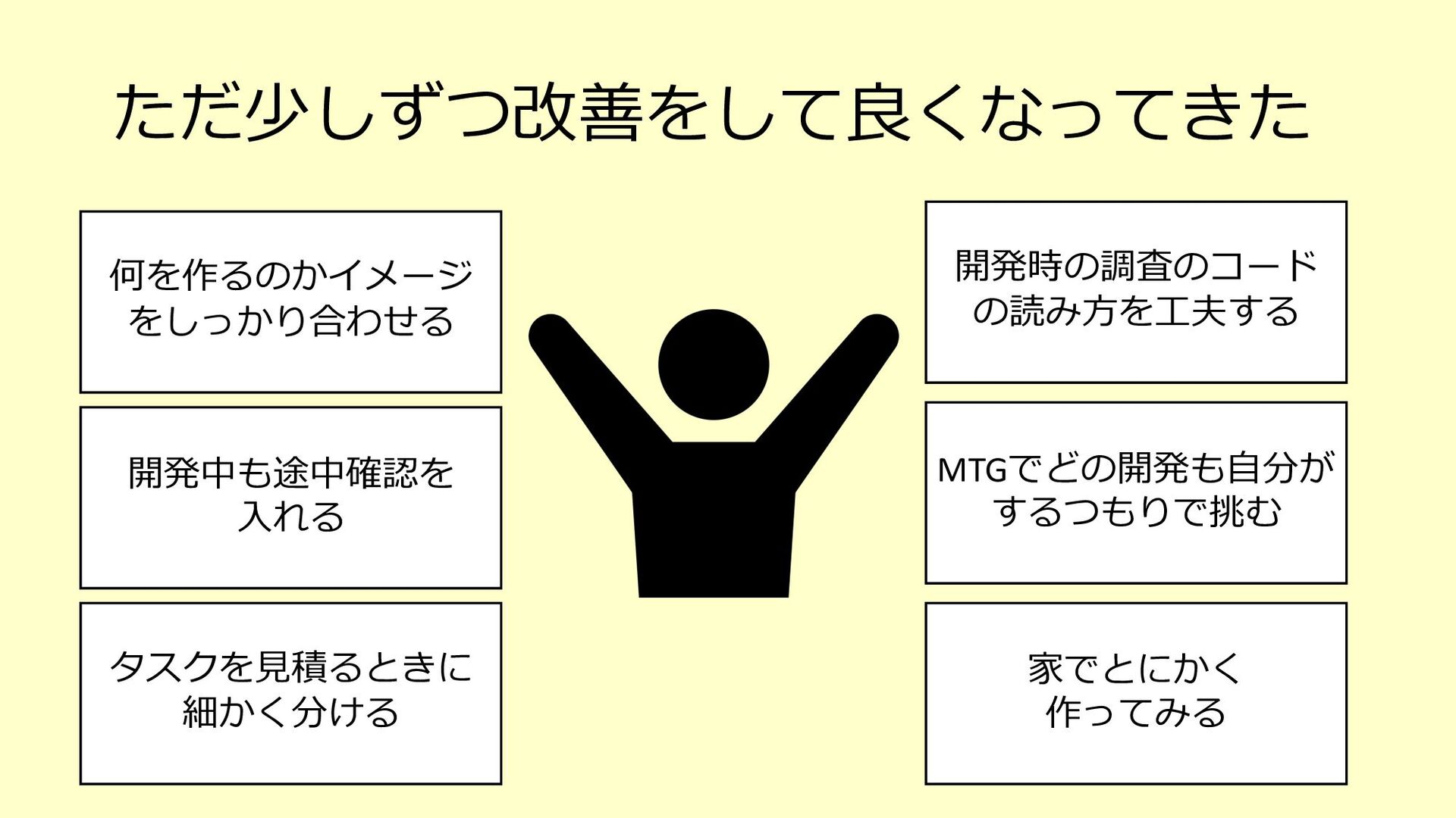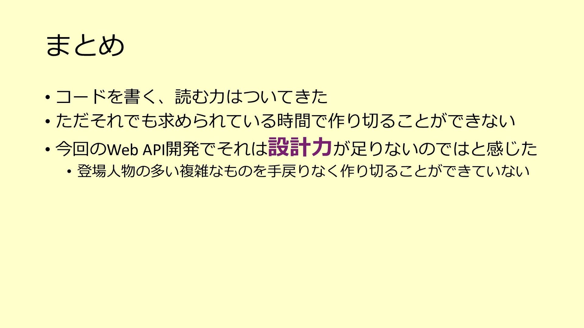 たな気づきになり、そのアクションが次の世代への育成にも繋がる o 「⼒不⾜です」と引き下がってしまったらその時点で⾃分もチームも思考が停⽌している、成⻑しない 3. チームで決めたサイズ感(想定⼯数)に対して、⾃分ならこれくらい時間がかかると ちゃんと伝えるべき(そのためにベロシティがあるはず) o 経験が⻑い⼈やそのシステムについて詳しい⼈がやったら早く終わるし、逆に経験浅い⼈やそのシステムを知らない ⼈が開発をしたら時間がかかることは⾄極真っ当なこと o そのためにベロシティも踏まえて、⾃分がやった場合の想定⼯数をしっかり伝える 4. PBIの下のタスクを1⽇以内まで分割して、⾒積もりがしやすい状態を作ってみる o スコープが⼩さくなることで、設計もしやすくなるかもしれない o 各タスクを4時間以内になるまで分割して進めているというケースもあるようです 5. 遅れていることをちゃんと「遅れている」とアラートを出せているだけでも実はすご いこと(良い意味で⾃⼰定義をあげる)
