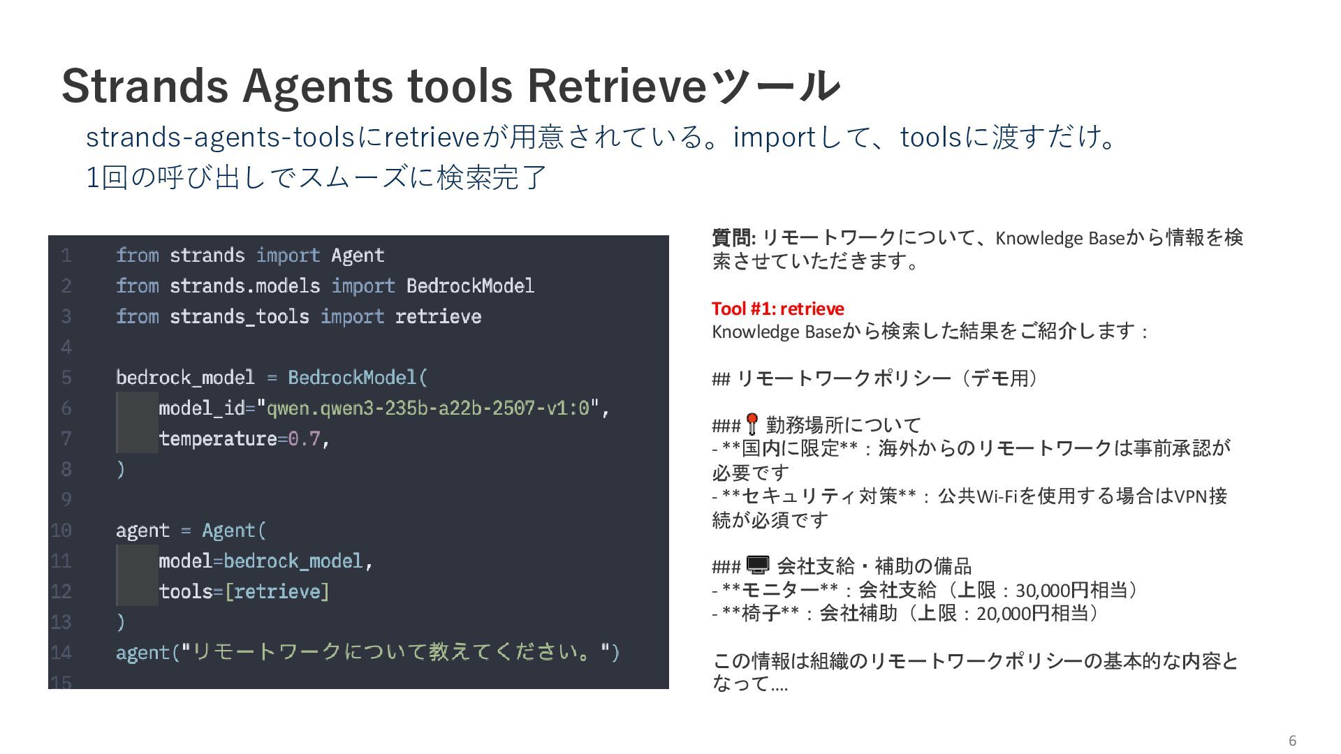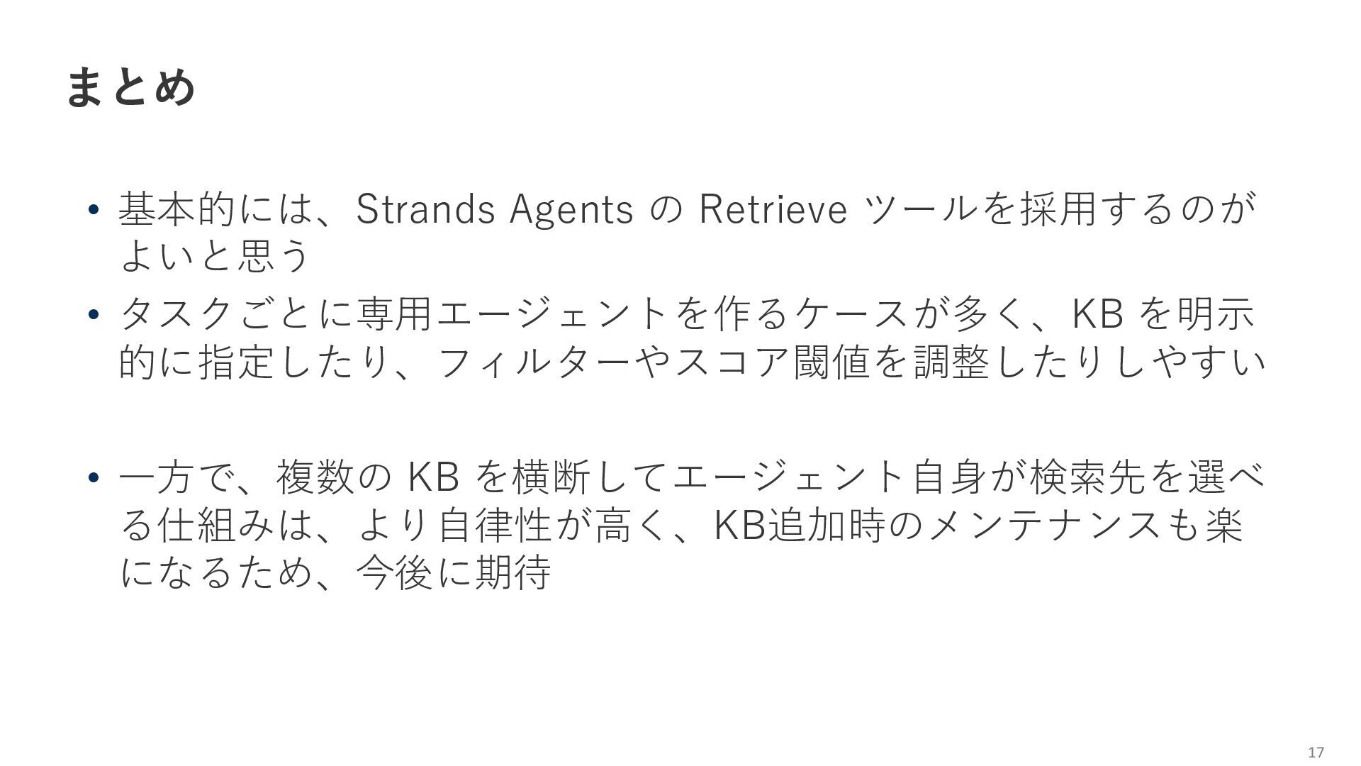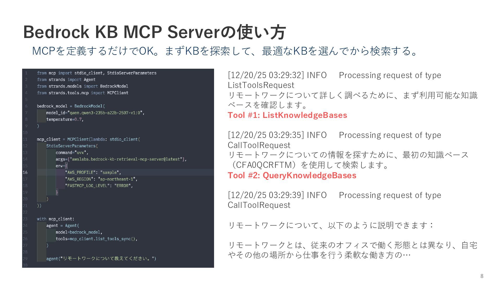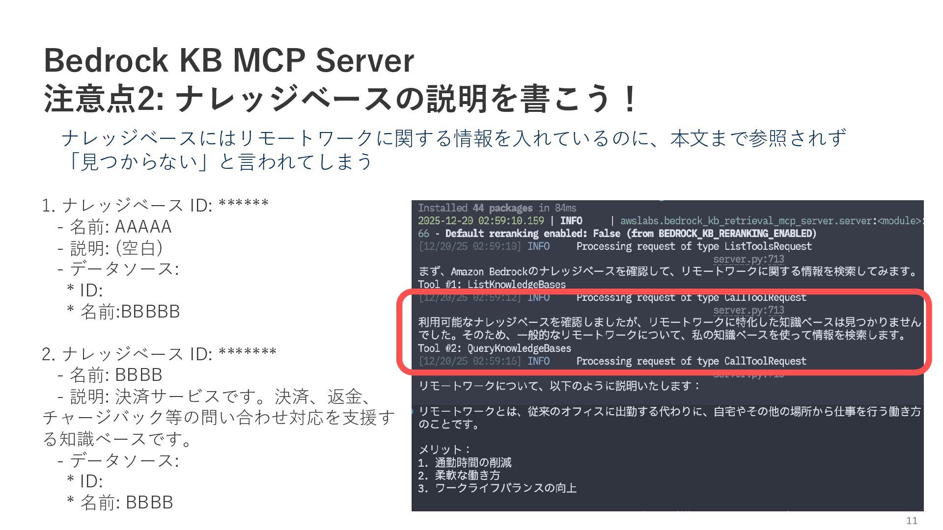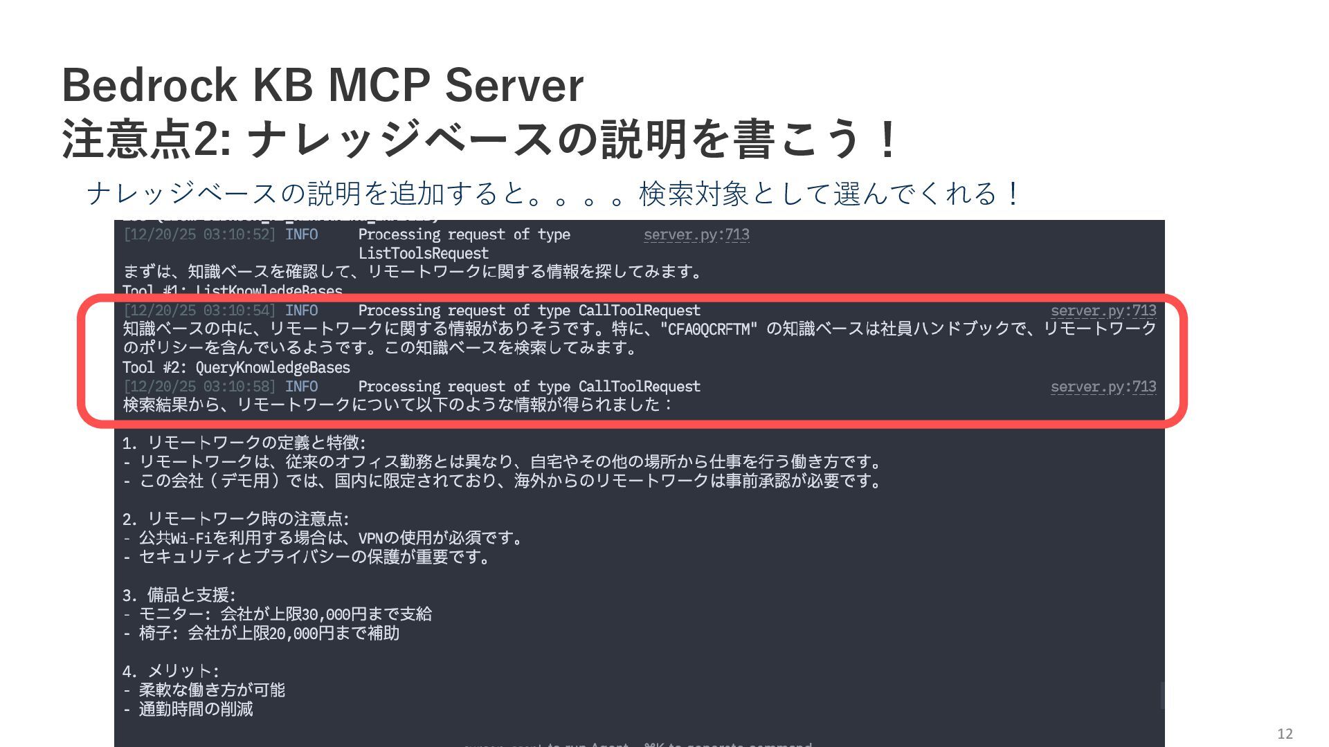 request of type ListToolsRequest リモートワークについて詳しく調べるために、まず利用可能な知識 ベースを確認します。 Tool #1: ListKnowledgeBases [12/20/25 03:29:35] INFO Processing request of type CallToolRequest リモートワークについての情報を探すために、最初の知識ベース (CFA0QCRFTM)を使用して検索します。 Tool #2: QueryKnowledgeBases [12/20/25 03:29:39] INFO Processing request of type CallToolRequest リモートワークについて、以下のように説明できます: リモートワークとは、従来のオフィスで働く形態とは異なり、自宅 やその他の場所から仕事を行う柔軟な働き方の…