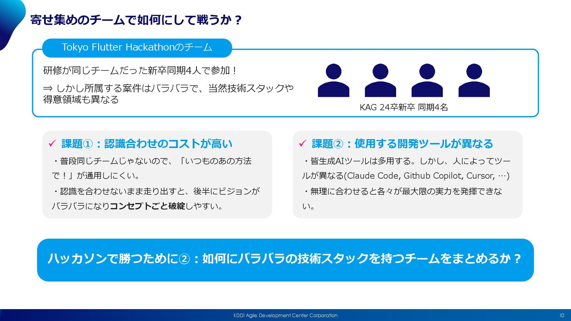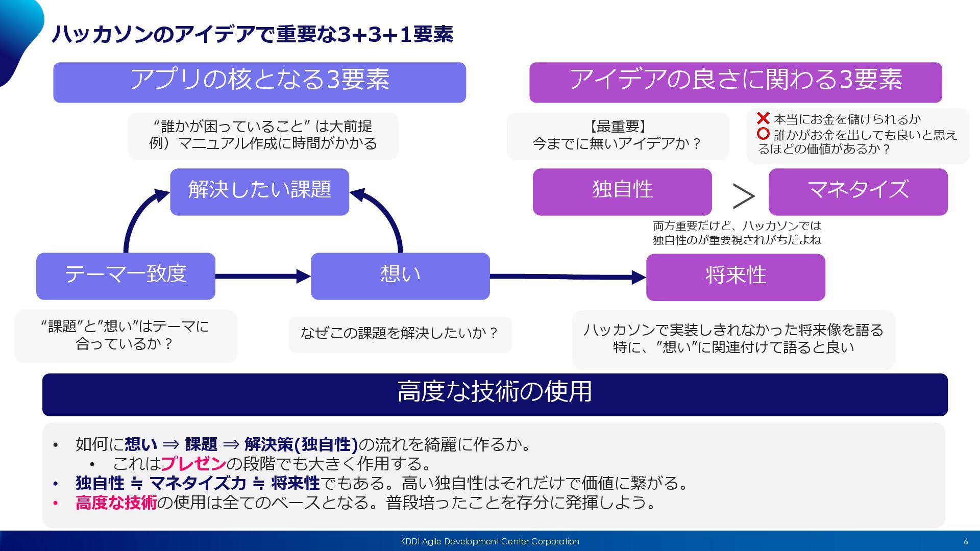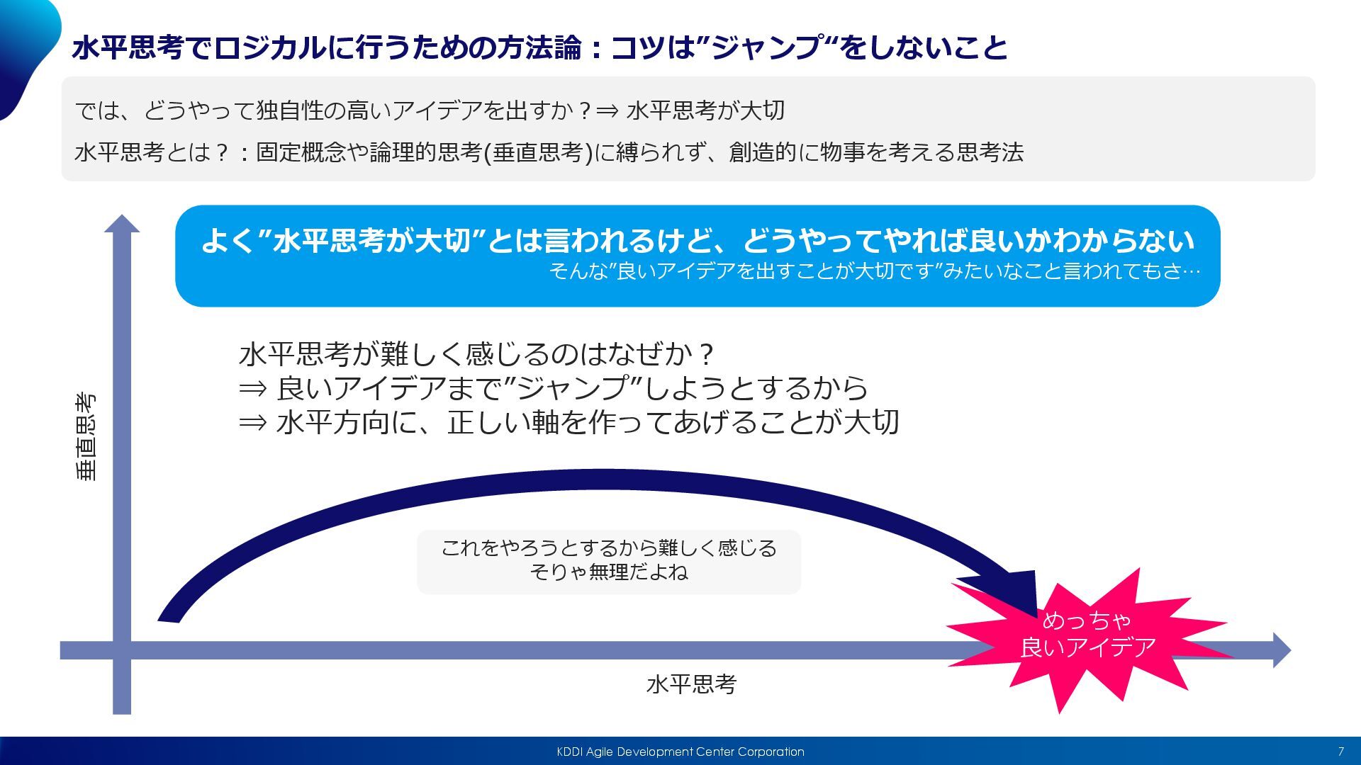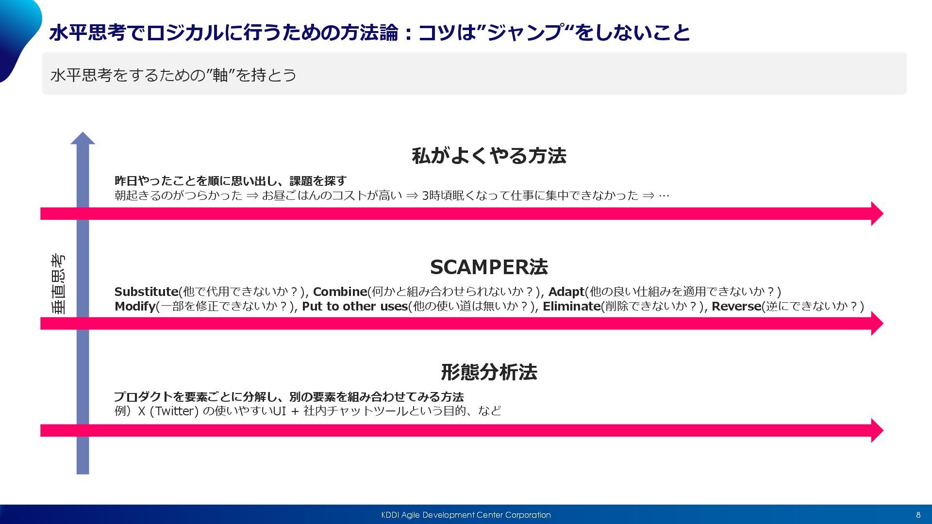 Substitute(他で代⽤できないか︖), Combine(何かと組み合わせられないか︖), Adapt(他の良い仕組みを適⽤できないか︖) Modify(⼀部を修正できないか︖), Put to other uses(他の使い道は無いか︖), Eliminate(削除できないか︖), Reverse(逆にできないか︖) 私がよくやる⽅法 昨⽇やったことを順に思い出し、課題を探す 朝起きるのがつらかった ⇒ お昼ごはんのコストが⾼い ⇒ 3時頃眠くなって仕事に集中できなかった ⇒ … 形態分析法 プロダクトを要素ごとに分解し、別の要素を組み合わせてみる⽅法 例)X (Twitter) の使いやすいUI + 社内チャットツールという⽬的、など