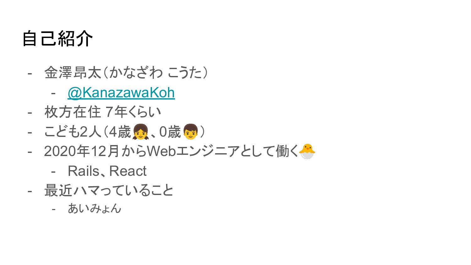 こども2人(4歳👧、0歳👦) - 2020年12月からWebエンジニアとして働く🐣 - Rails、React - 最近ハマっていること - あいみょん