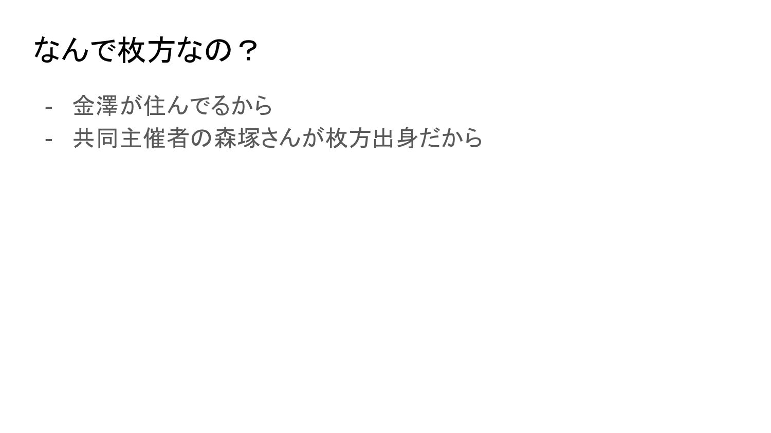 なんで枚方なの? - 金澤が住んでるから - 共同主催者の森塚さんが枚方出身だから
