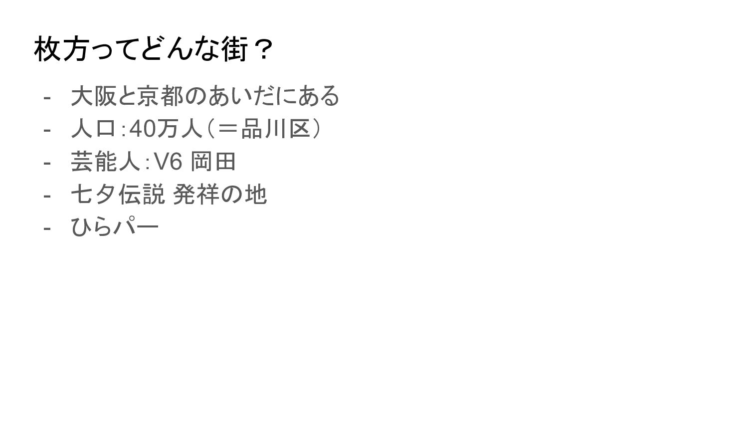 枚方ってどんな街? - 大阪と京都のあいだにある - 人口:40万人(=品川区) - 芸能人:V6 岡田 - 七夕伝説