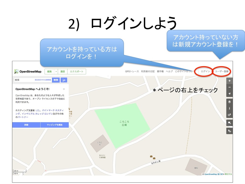 2) ログインしよう アカウント持っていない方 は新規アカウント登録を! アカウントを持っている方は ログインを! *ページの右上をチェック