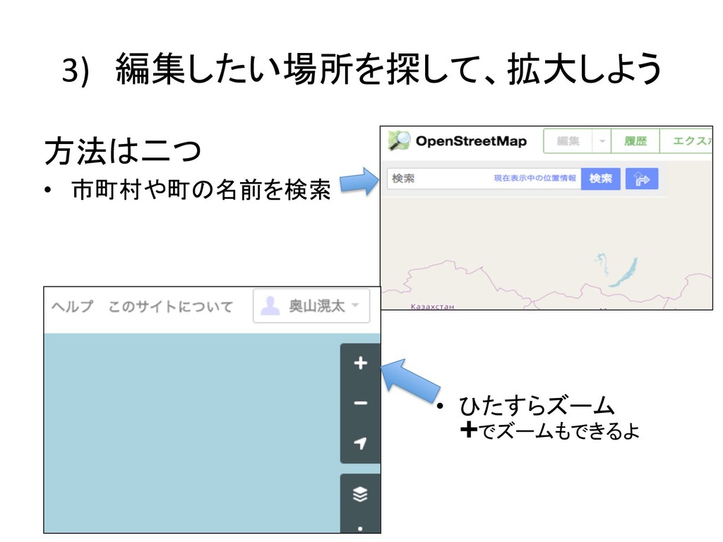3) 編集したい場所を探して、拡大しよう 方法は二つ • 市町村や町の名前を検索 • ひたすらズーム ➕でズームもできるよ