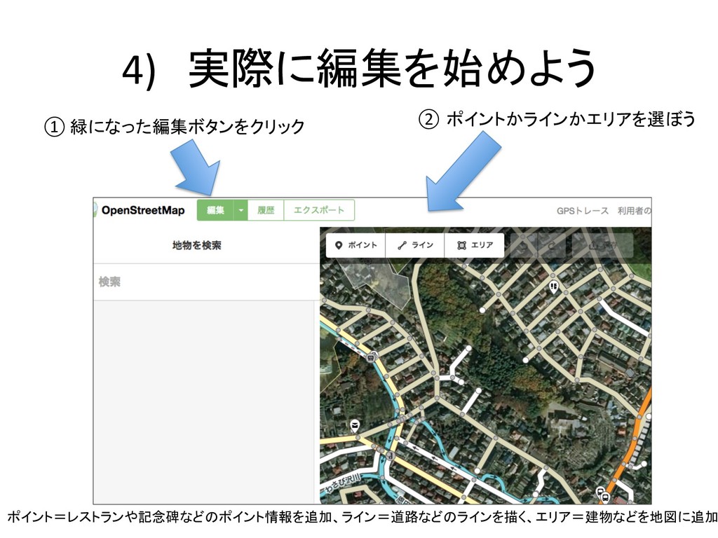 4) 実際に編集を始めよう ① 緑になった編集ボタンをクリック ② ポイントかラインかエリアを選ぼう ポイント=レストランや記念碑などのポイント情報を追加、ライン=道路などのラインを描く、エリア=建物などを地図に追加