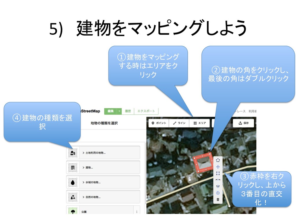 5) 建物をマッピングしよう ①建物をマッピング する時はエリアをク リック ②建物の角をクリックし、 最後の角はダブルクリック ③赤枠を右ク リックし、上から 3番目の直交 化!