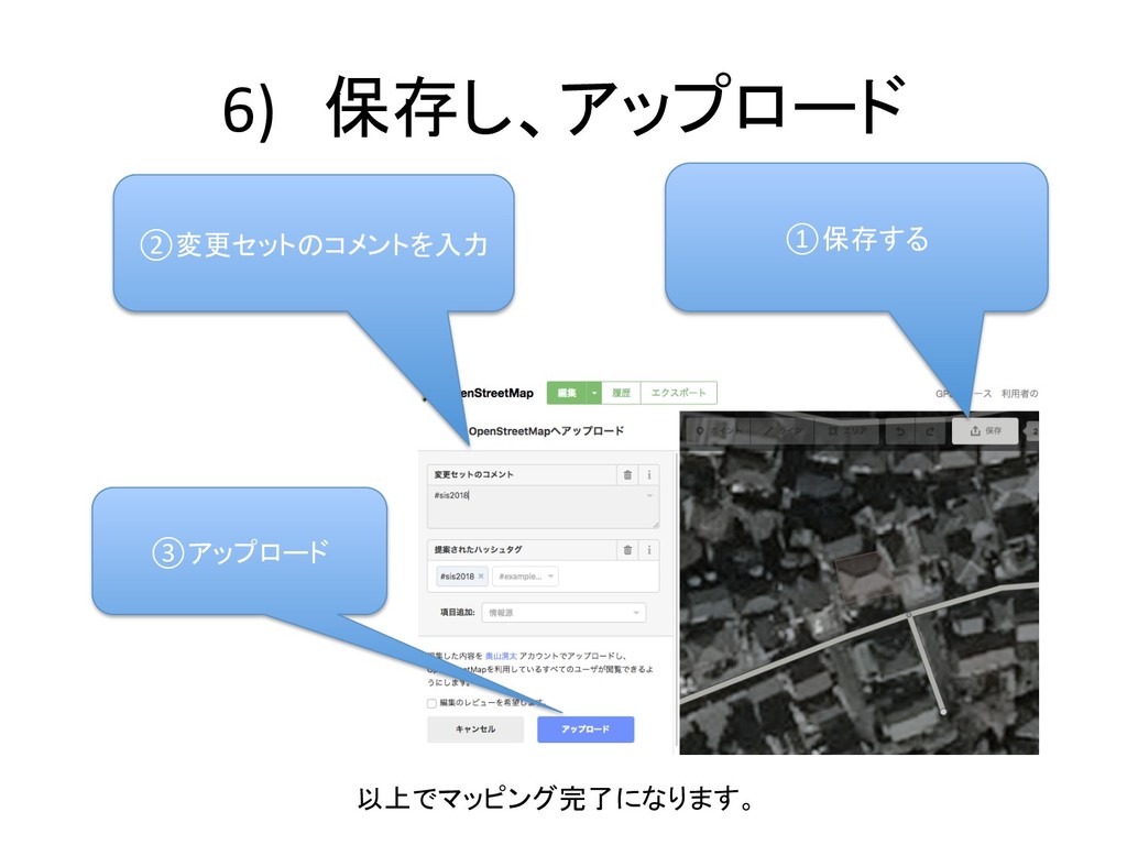 6) 保存し、アップロード ①保存する ②変更セットのコメントを入力 ③アップロード 以上でマッピング完了になります。
