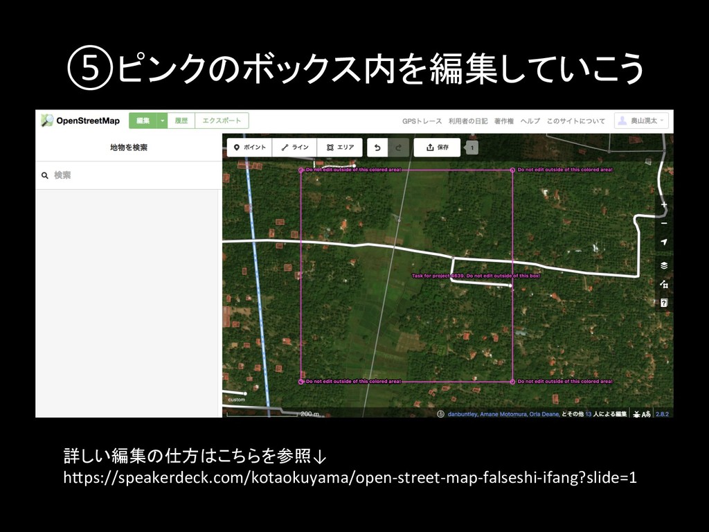 ⑤ピンクのボックス内を編集していこう 詳しい編集の仕方はこちらを参照↓ h7ps://speakerdeck.com/kotaokuyama/open-street-map-falseshi-ifang?slide=1