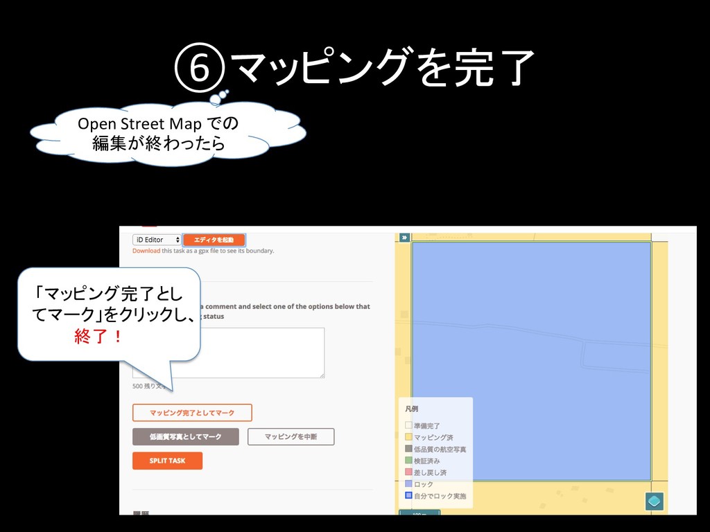 ⑥マッピングを完了 Open Street Map での 編集が終わったら 「マッピング完了とし てマーク」をクリックし、 終了!!