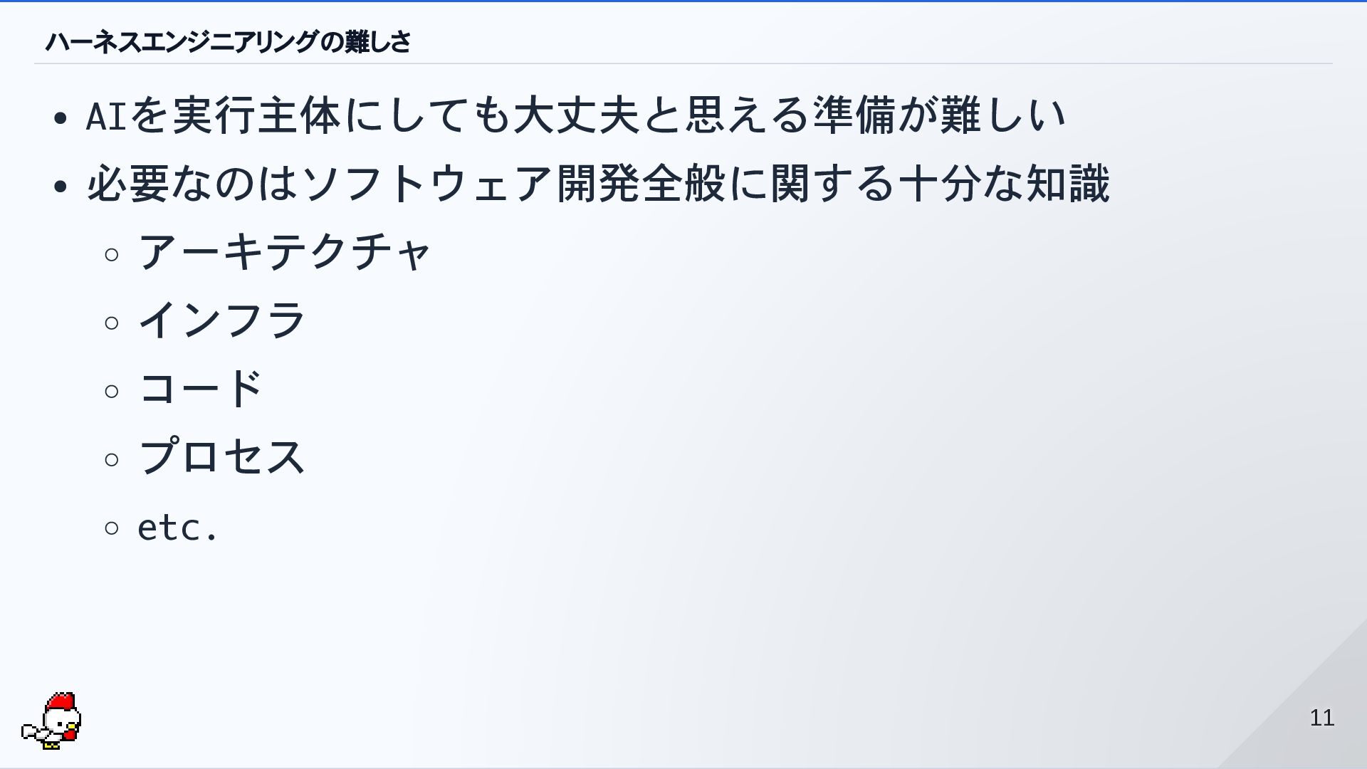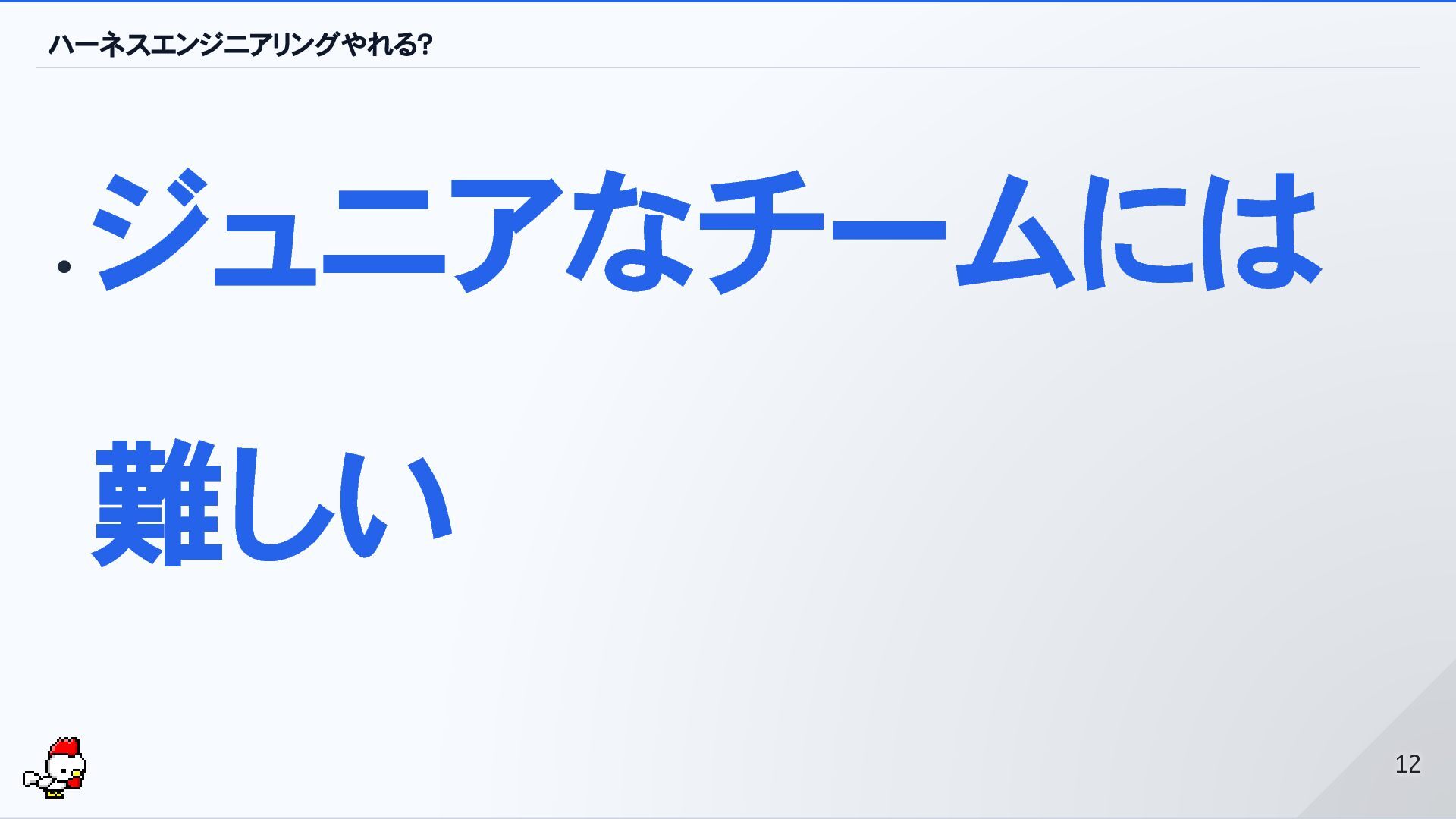 ハーネスエンジニアリングの難しさ AIを実行主体にしても大丈夫と思える準備が難しい 必要なのはソフトウェア開発全般に関する十分な知識 アーキテクチャ インフラ コード プロセス etc. 11 11