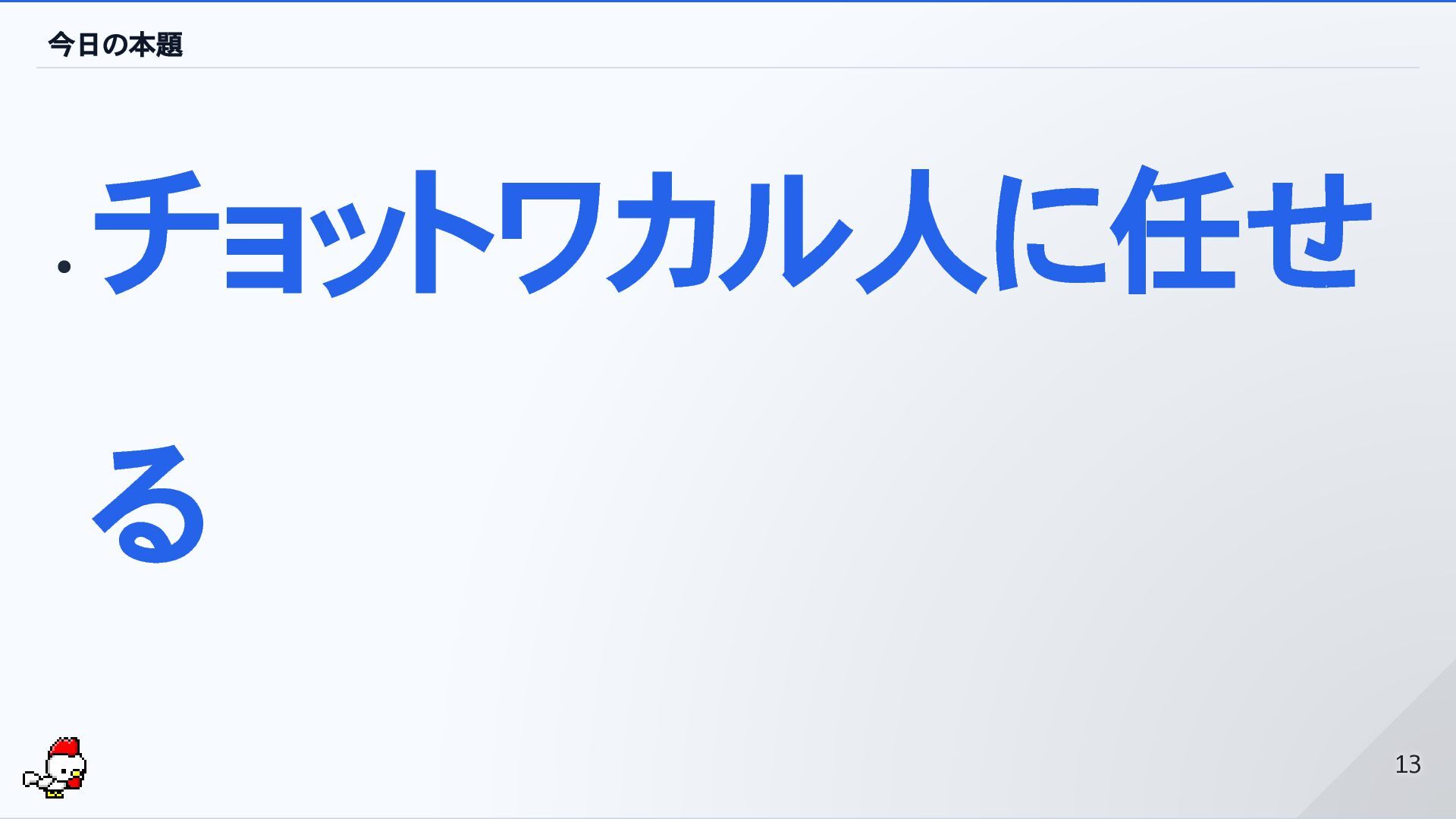 今日の本題 チョットワカル人に任せ る 13 13